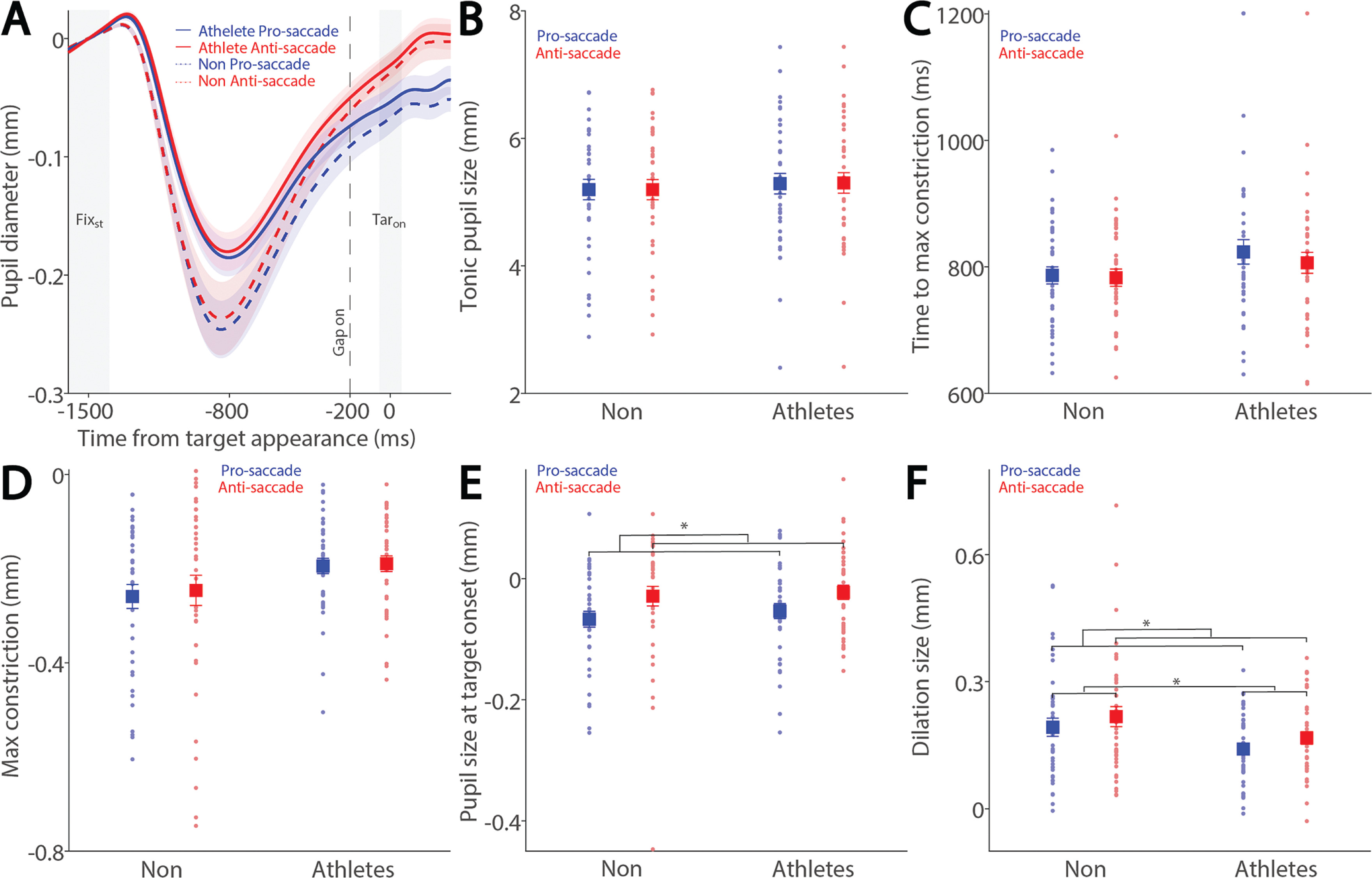Pupil size during instructed fixation between athletes and non-athletes. (A) Pupil dynamics (baseline-corrected to FIXst) between the pro- and anti-saccade conditions in athletes (N = 40) and non-athletes (N = 40). (B) Tonic pupil size in the FIXst epoch is shown for different conditions between athletes and non-athletes. (C) Time to max constriction is shown for different conditions between athletes and non-athletes. (D) Max constriction magnitude is shown for different conditions between athletes and non-athletes. (E) Pupil size in the TARon epoch is shown for different conditions between athletes and non-athletes. (F) Dilation size is shown for different conditions between athletes and non-athletes. The shaded colored regions surrounding pupil dynamics curves represent the ± standard error range (across participants) for different conditions. The color-filled squares and error bars represent mean value ± standard error (across participants) for each condition, and the small circles represent mean value for each subject. Color dots represent each data point. The grey area represents the epoch selected for analyses. * indicates differences are statistically significant. Non: non-athletes.
