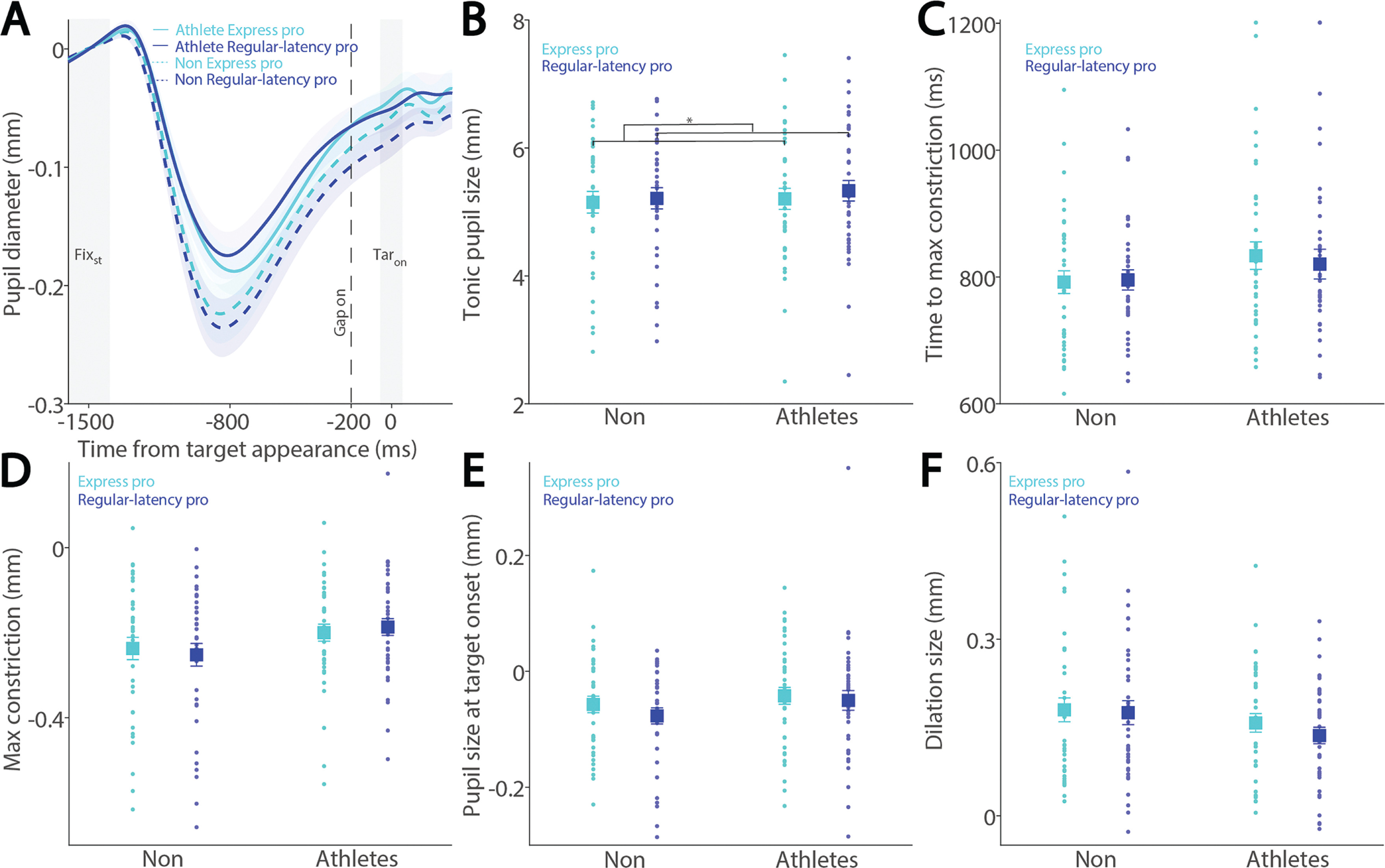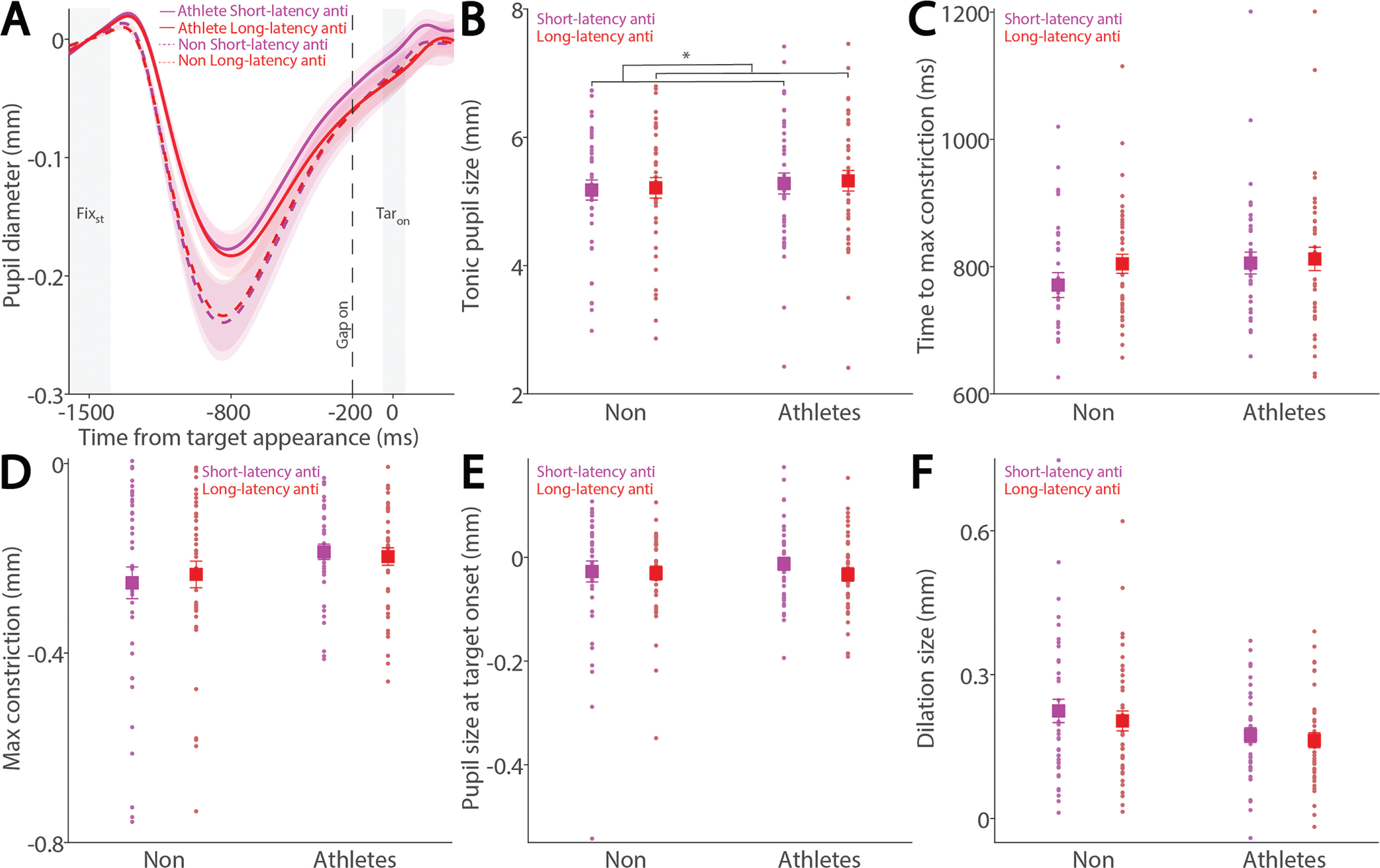 Pupil size for trials with faster and slower pro-saccades between athletes and non-athletes. (A) Pupil dynamics between the pro- and anti-saccade conditions in athletes and non-athletes. (B) Tonic pupil size in the FIXst epoch is shown for different conditions between athletes and non-athletes. (C) Time to max constriction is shown for different conditions between athletes and non-athletes. (D) Max constriction magnitude is shown for different conditions between athletes and non-athletes. (E) Pupil size in the TARon epoch is shown for different conditions between athletes and non-athletes. (F) Dilation size is shown for different conditions between athletes and non-athletes. The shaded colored regions surrounding pupil dynamics curves represent the ± standard error range (across participants) for different conditions. The color-filled squares and error bars represent mean value ± standard error (across participants) for each condition, and the small circles represent mean value for each subject. Color dots represent each data point. The grey area represents the epoch selected for analyses. * indicates differences are statistically significant. Non: non-athletes.