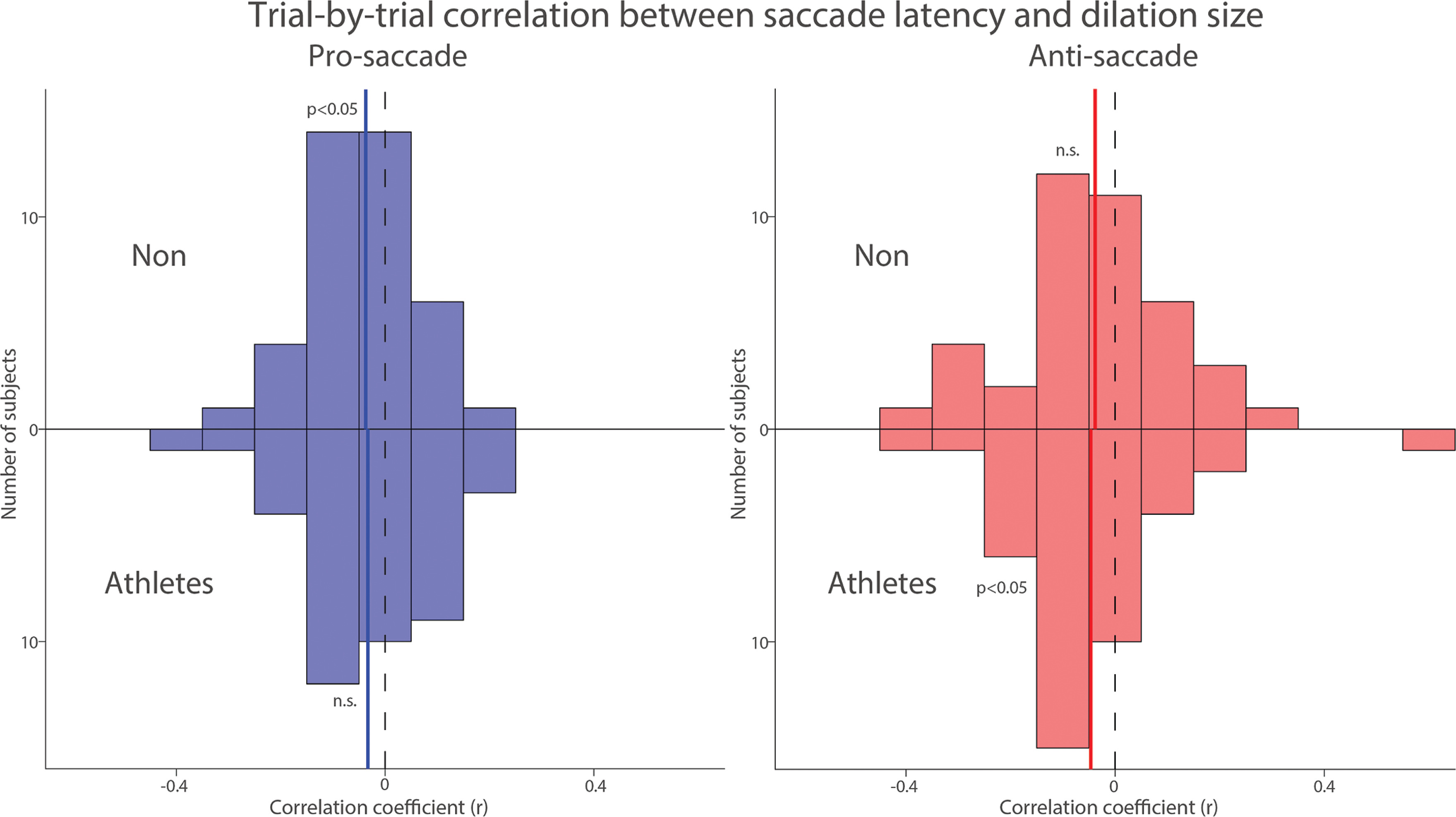 Trial-by-trial correlation between dilation size and saccade peak velocity between athletes and non-athletes. Distribution of correlation coefficients (Fisher’s z-transformed) for the relationship between pupil dilation size and saccade reaction times across different conditions and groups. The vertical black dashed and colored solid lines represent the zero and median value of the correlation coefficient. n.s.: non-significant. Non: non-athletes.