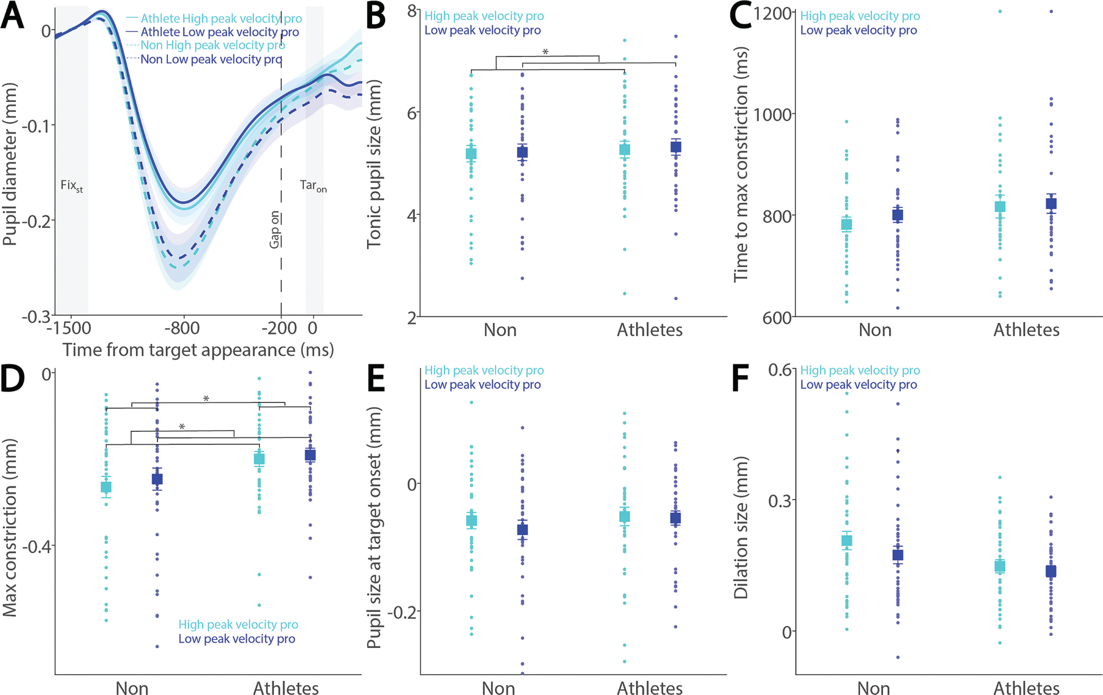 Pupil size for trials with higher and lower saccade peak velocities in pro-saccades between athletes and non-athletes. (A) Pupil dynamics between the pro- and anti-saccade conditions in athletes and non-athletes. (B) Tonic pupil size in the FIXst epoch is shown for different conditions between athletes and non-athletes. (C) Time to max constriction is shown for different conditions between athletes and non-athletes. (D) Max constriction magnitude is shown for different conditions between athletes and non-athletes. (E) Pupil size in the TARon epoch is shown for different conditions between athletes and non-athletes. (F) Dilation size is shown for different conditions between athletes and non-athletes. The shaded colored regions surrounding pupil dynamics curves represent the ± standard error range (across participants) for different conditions. The color-filled squares and error bars represent mean value ± standard error (across participants) for each condition, and the small circles represent mean value for each subject. Color dots represent each data point. The grey area represents the epoch selected for analyses. * indicates differences are statistically significant. Non: non-athletes.