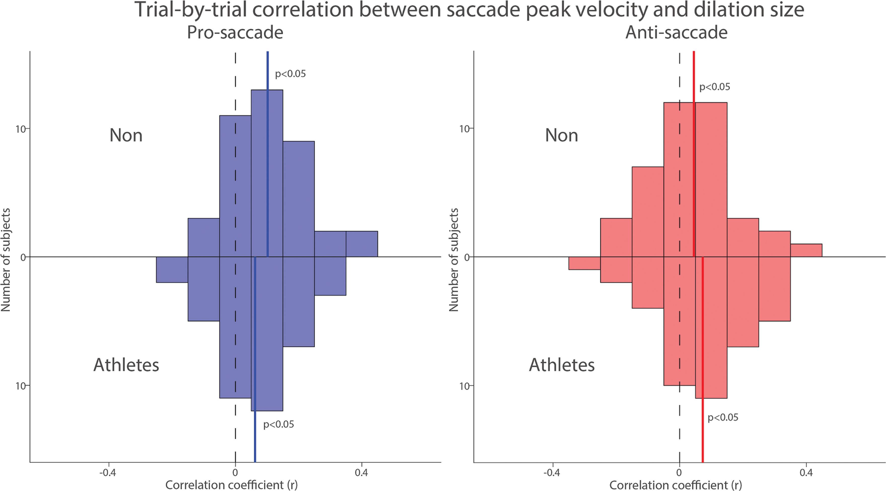 To examine trial-by-trial relationship between pupil dilation and saccade peak velocity, we correlated pupil dilation magnitude with saccade peak velocity for each subject in both groups. Figure 8 summarizes the distribution of correlation coefficients after applying Fisher’s z-transformation across all participants. Significant positive correlations between pupil dilation and saccade peak velocity were observed in both the pro- and anti-saccade conditions for both groups, indicating that larger pupil dilation was associated with higher saccade peak velocities (Fig. 8, NON: pro: t(39) = 5.353, p < 0.001, d = 0.846; anti: t(39) = 2.124, p = 0.040, d = 0.336; Athletes: pro: t(39) = 3.184, p = 0.003, d = 0.503; anti: t(39) = 3.176, p = 0.003, d = 0.502). Overall, these results suggest that pupil metrics before target appearance are associated with the speed of saccades generated in both groups.