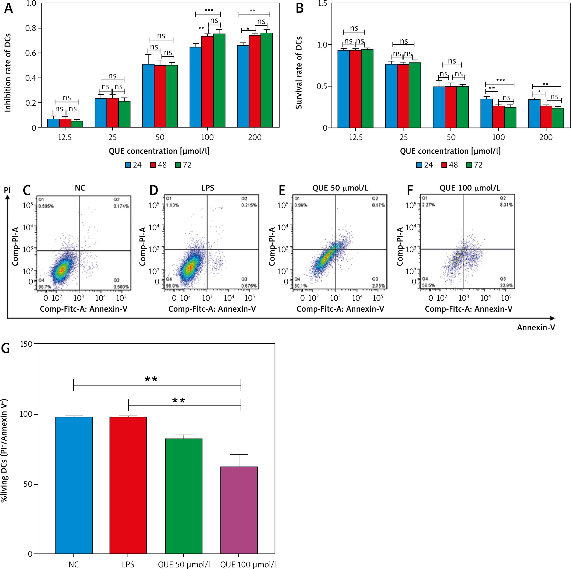 We observed the effect of different concentrations of QUE on DCs at different periods. The results of our CCK-8 assays showed that after DCs were treated with QUE at concentration gradients of 0 µmol/l, 12.5 µmol/l, 25 µmol/l, 50 µmol/l, 100 µmol/l, and 200 µmol/l for 24, 48, and 72 hours, the inhibition rate of QUE on DCs was gradually enhanced with the increase of QUE dose and action time. The inhibition rate gradually reached saturation with the increase of QUE concentration and action time. The results for the survival rate of DCs were the exact opposite of those for the inhibition rate of DCs. When the QUE concentration was 100 µmol/l and 200 µmol/l, the survival rate and inhibition rate of DCs for 48 and 72 hours were statistically significant compared with that for 24 hours. The results of the apoptosis assays showed that the rate of living DCs (annexin V-/Pi-) decreased with increasing QUE concentration when different concentrations of QUE were applied to DCs. The higher the QUE concentration, the fewer living DCs there were. At different action times (24, 48, and 72 hours), QUE began to have significant effects on living DCs when the concentration of QUE was 100 µmol/l, and the difference was statistically significant (Fig. 1). This also indicates that apoptosis of DCs can be significantly induced when the QUE concentration is 100 µmol/l. Therefore, we think that QUE plays a role by affecting the activity and function of DCs. We used a QUE concentration of 100 µmol/l and action time of 24 hours to conduct follow-up experiments.