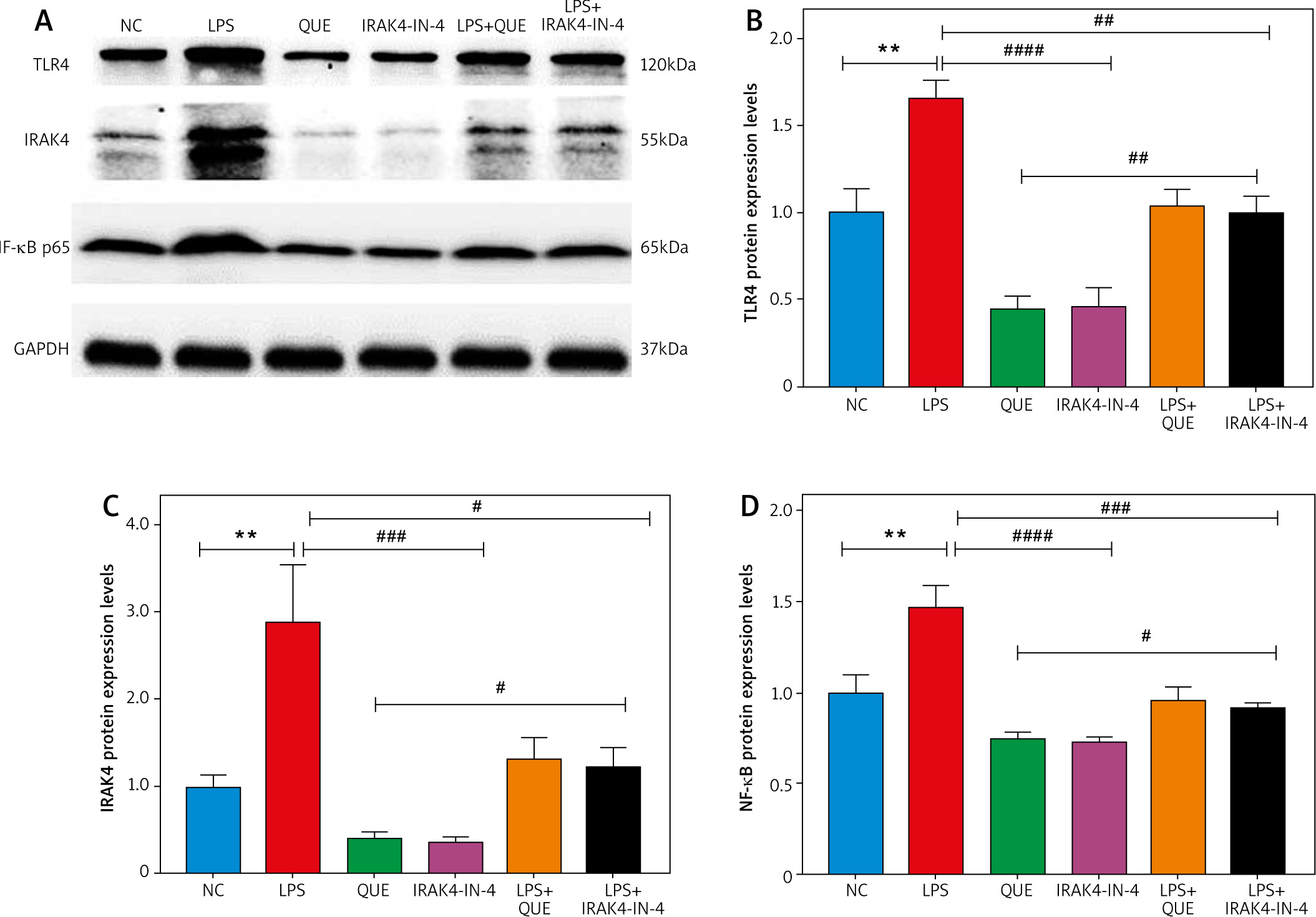 Effect of quercetin and IRAK4-IN-4 on TLR4, IRAK4, and NF-κB p65 proteins (n = 3 per group, error bars are mean ±SEM). Relative expression of TLR4, IRAK4, and NF-κB p65 proteins (A). Statistical results of relative expression of TLR4, IRAK4, and NF-κB p65 proteins (B–D). Lipopolysaccharide group compared with NC group. LPS group compared with the QUE and IRAK4-IN-4 group