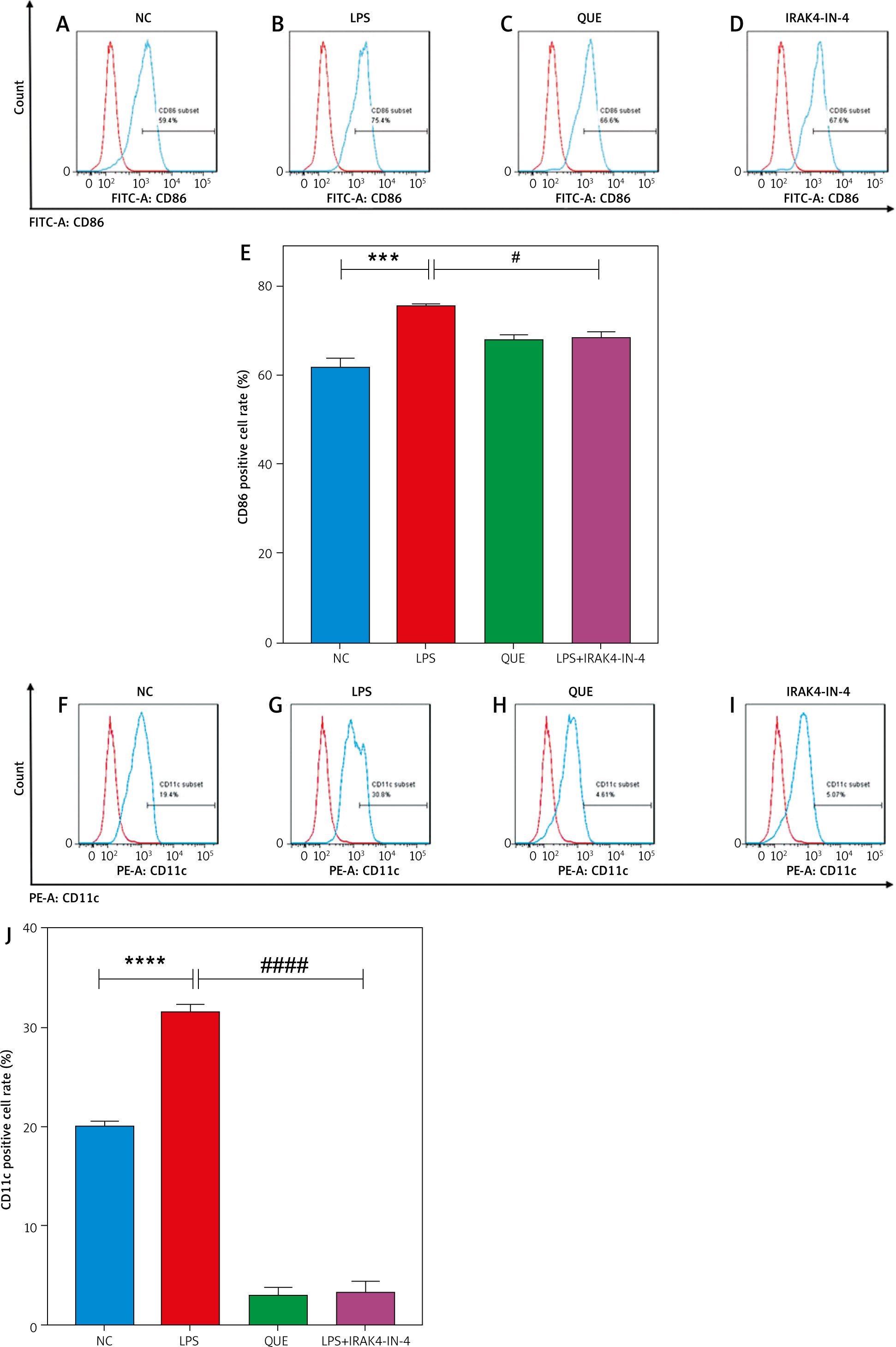 Effect of quercetin (QUE) on the ratio of CD86- and CD11cpositive cells on the dendritic cells surface (n = 3 per group, error are the mean ±SEM). The ratio of CD86- and CD11c-positive cells among the various groups, separately (A–D, F–I). Statistical graph of the ratio of CD86 and CD11c positive cells, separately (E, J). Lipopolysaccharide group compared with the normal control group. Lipopolysaccharide group compared with the QUE and IRAK4-IN-4 group