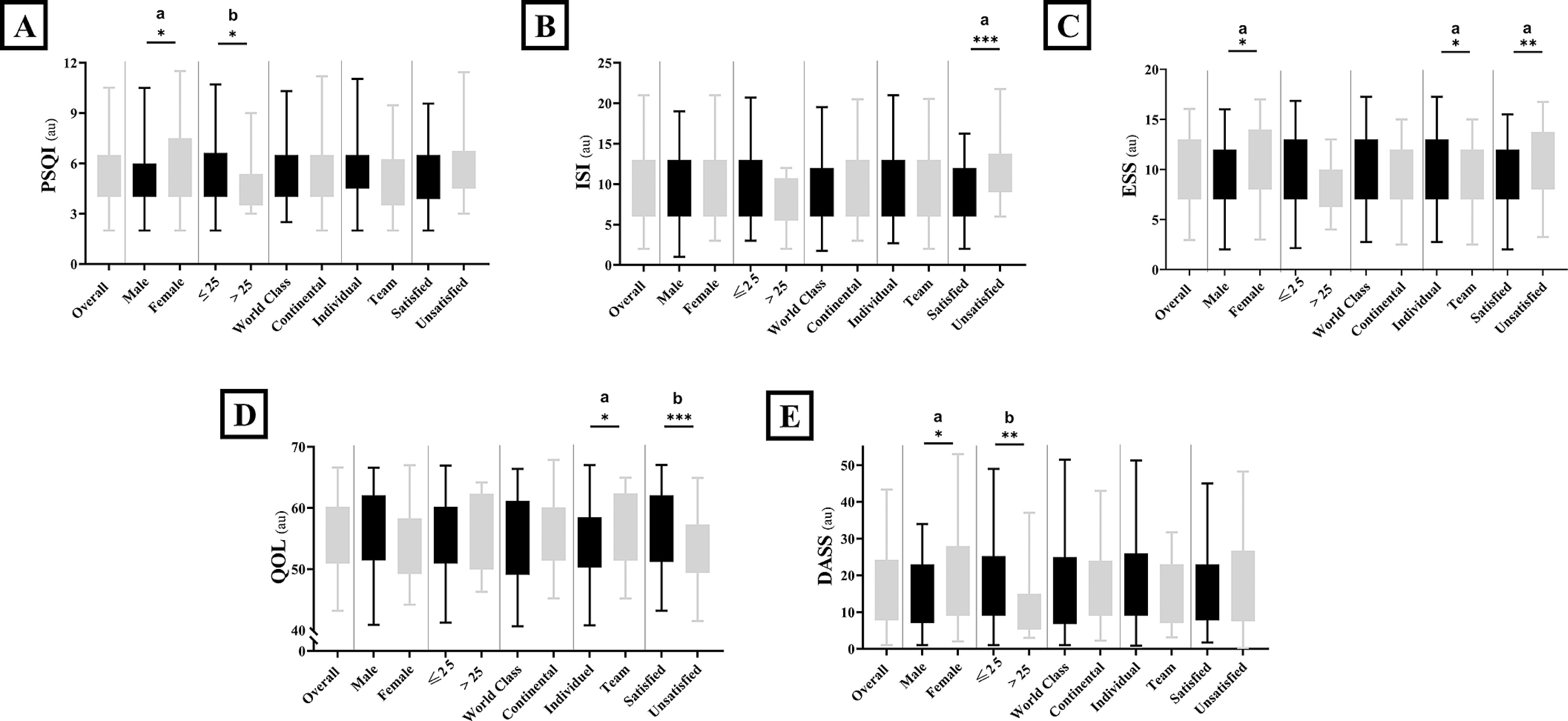 Box and whiskers of the Pittsburgh sleep quality index (a: PSQI), insomnia severity index (b: ISI), Epworth sleepiness scale (c: PSQI), the quality of life (d: QOL) and the depression, anxiety, stress scale (e: DASS) for the overall sample (n = 118) and for subgroups; male (n = 79) and female (n = 39) athletes; ≤ 25 years (n = 102) and > 25 years (n = 16); World class elite (n = 50) and international elite (n = 68); individual (n = 76) and team sport (n = 42) athletes; satisfied (n = 74) and unsatisfied (n = 44) with their achieved performance so far. *, **and *** means significant within group difference at p < 0.05, p < 0.01 and p < 0.001, respectively, with a, b and c presenting; small, medium and large Cohen’s effect size, respectively. Data are presented as mean and 95% confidence interval and the difference between subgroups was assessed by the independent sample t test.