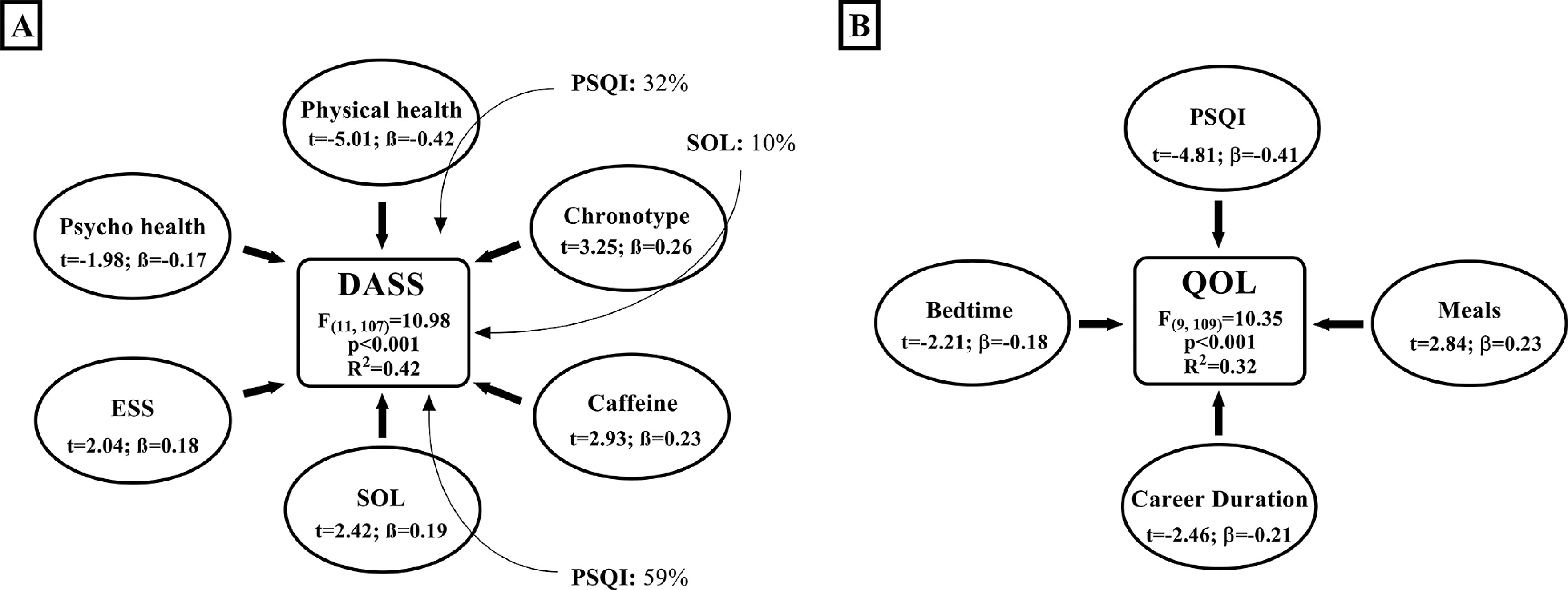Depression, anxiety, stress scale (DASS, Figure 3a). Other independent variables significantly contributing to the model include; nap timing: t = -2.28, ß = -0.18, p < 0.01 and social interaction: t = 2.15, ß = 0.18, p < 0.01.