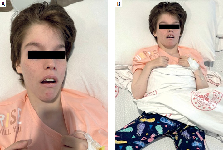 On physical examination, the patient had a neuromotor retarded appearance. She was conscious but not coherent. The patient was quadriplegic with widespread joint contractures in the upper and lower extremities (Figure 1). Bilateral subcrepitant rales were heard by listening in the lungs. There were no other pathologic findings on systemic examination.
