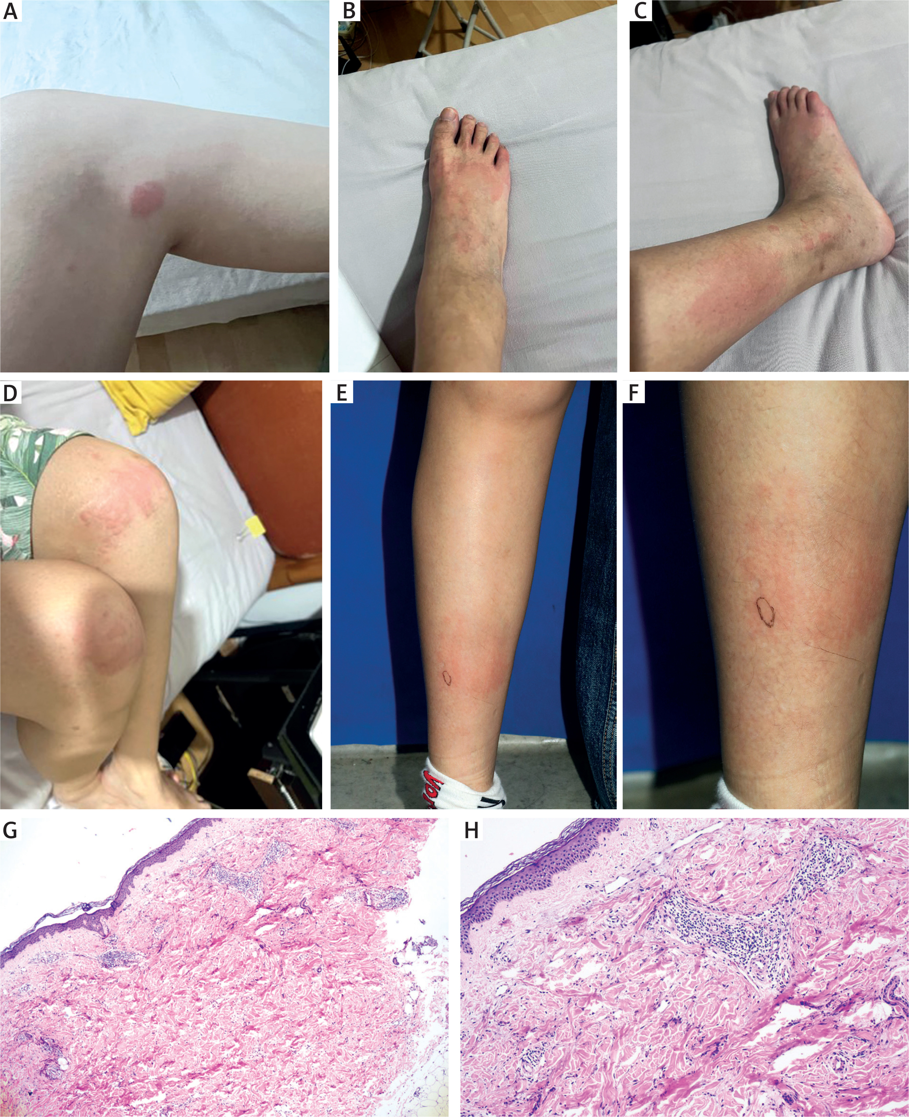 Clinical and histopathological features of the patient. A-D – New-onset urticarial lesions during consultation at our hospital, demonstrating polymorphic, variably sized erythematous wheals with associated post-inflammatory hyperpigmentation in some areas. E, F – Biopsy site of a persistent wheal. G, H – Histopathology revealing perivascular inflammation with prominent eosinophilic infiltration (H&E staining, ×200)