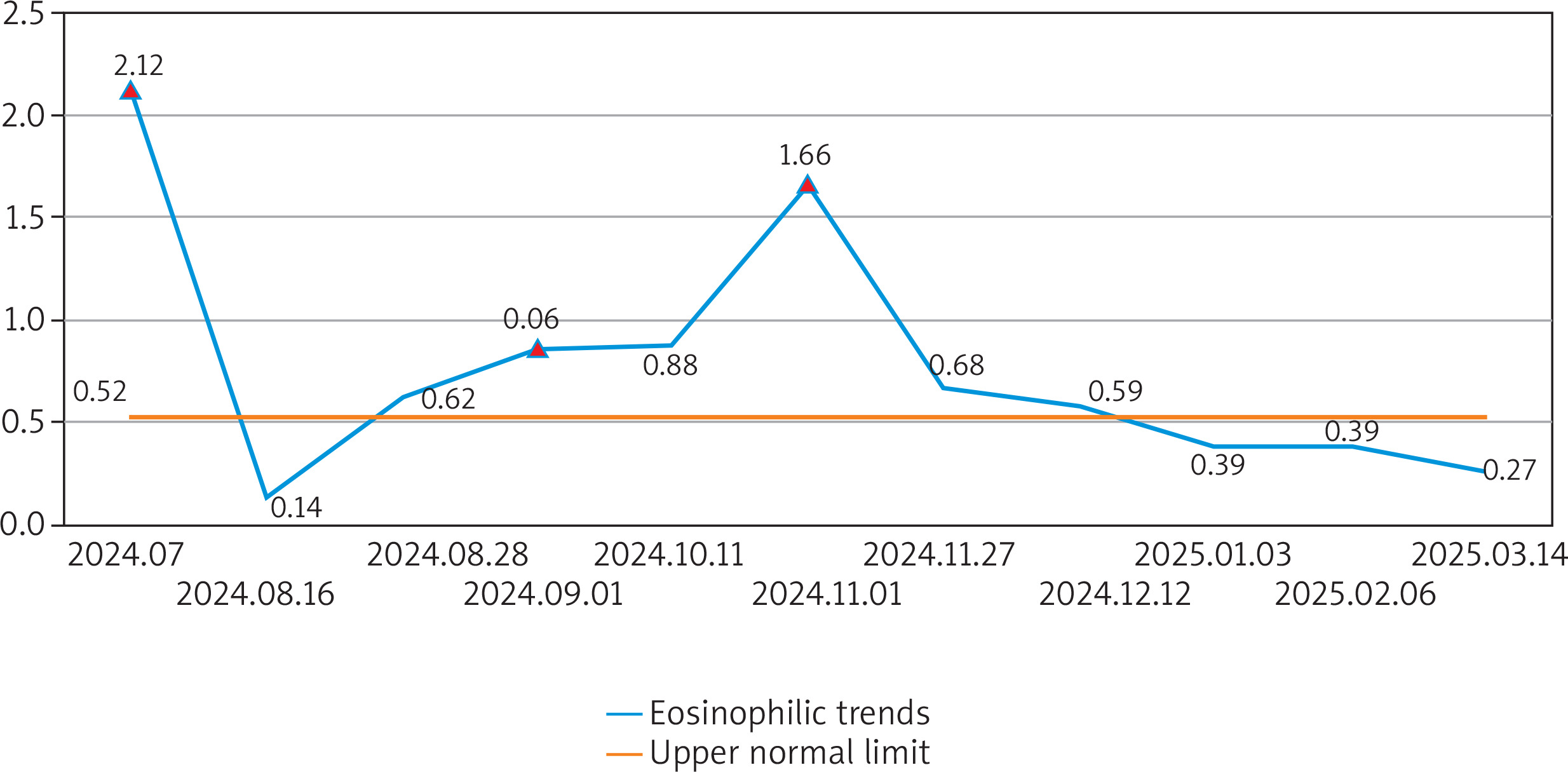 Dynamics of eosinophil levels during disease progression and treatment. The blue trend line illustrates serial eosinophil counts (×109/l) throughout the patient’s clinical course. The yellow horizontal line indicates the upper limit of normal eosinophil levels. Three red triangles mark critical therapeutic interventions: first intramuscular glucocorticoid injection; initiation of omalizumab therapy; diagnostic antiparasitic treatment (albendazole)