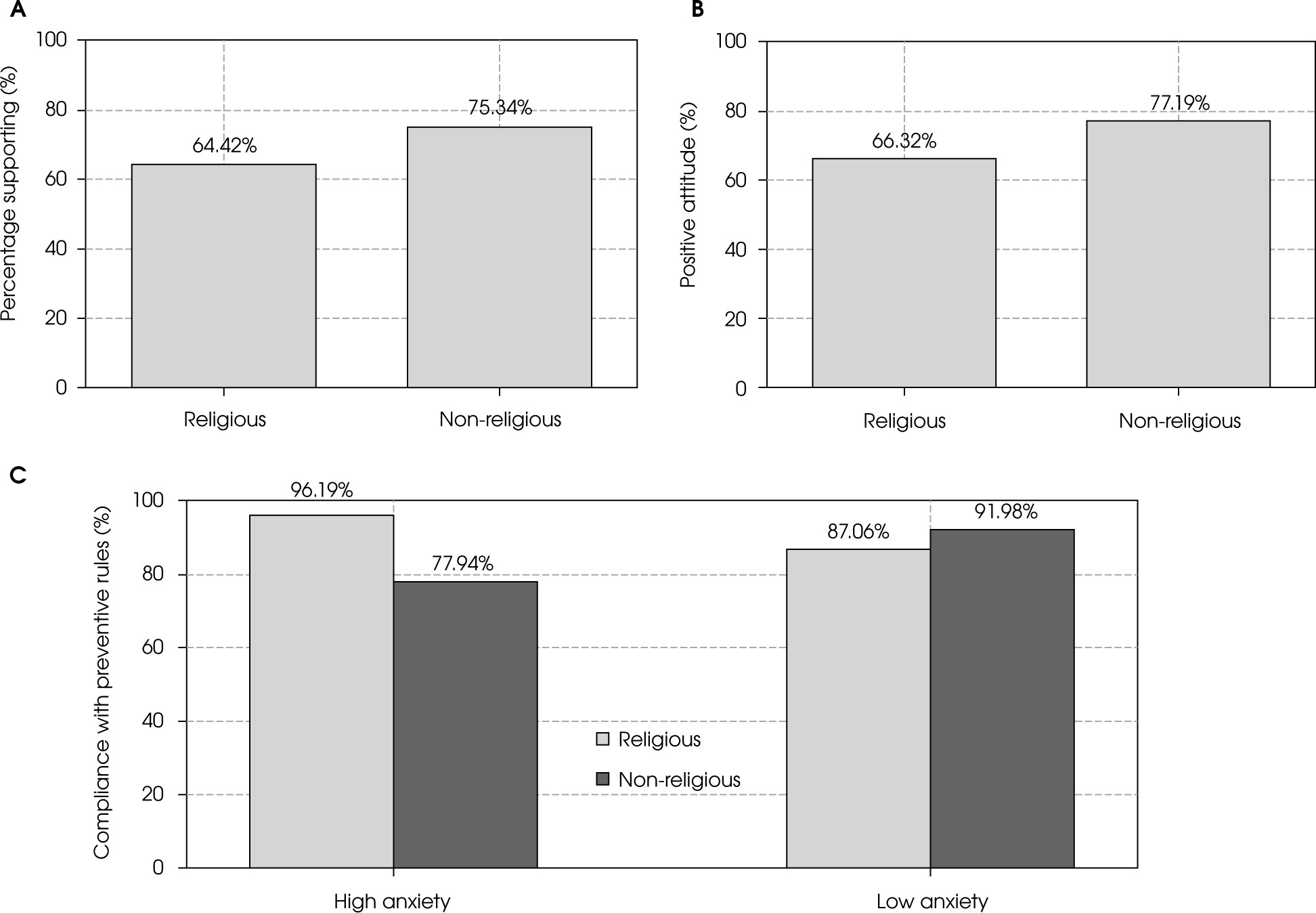 The relationship between anxiety levels and positive attitudes toward compliance with preventive measures, support for restrictions, and attitudes toward vaccination among religious and non-religious individuals