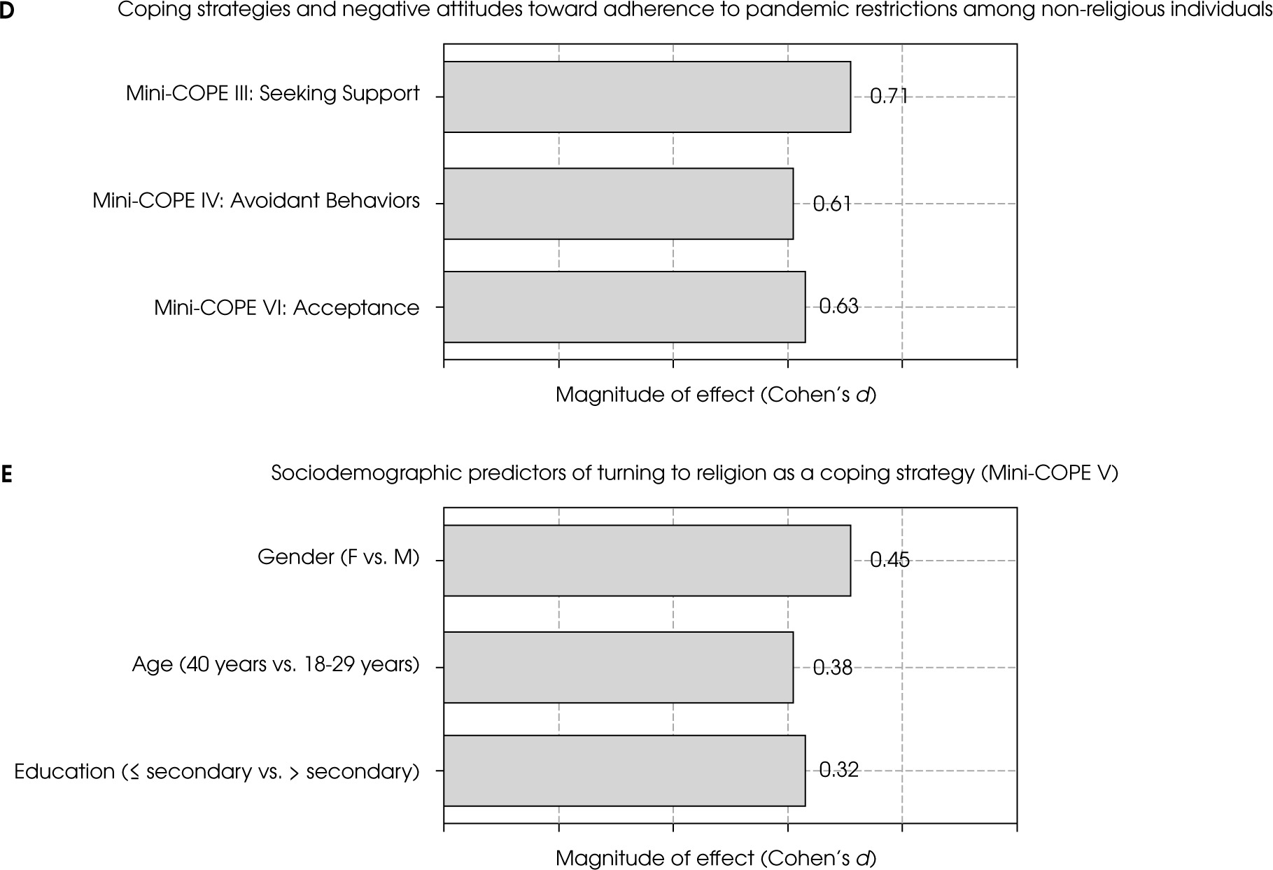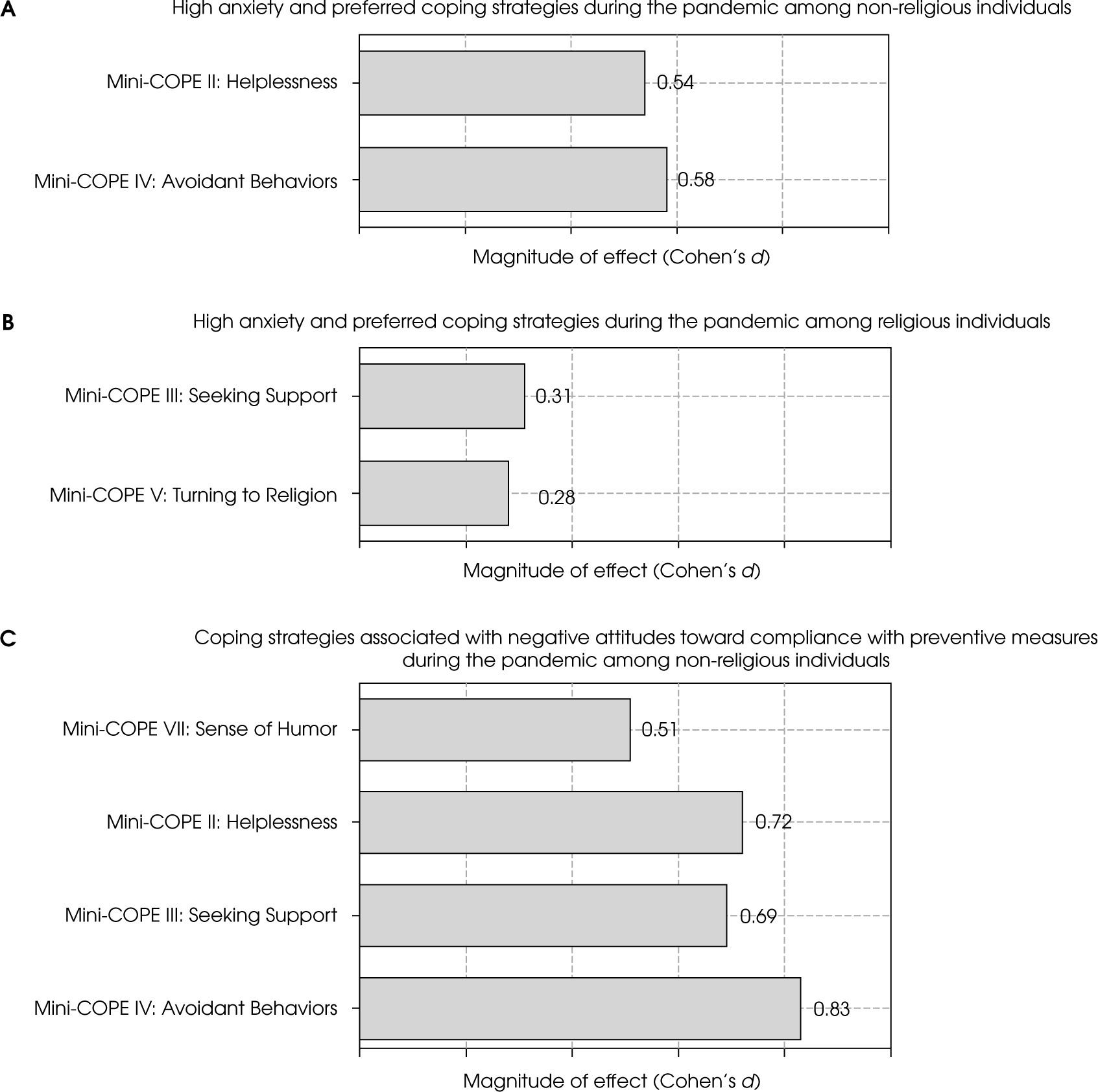 All these effects ranged from moderate to strong in terms of magnitude. In contrast, within the group of religious individuals only one significant difference emerged: those who opposed preventive measures more frequently used strategies based on seeking support (Factor III; t(250) = 1.67; p < 0.05), although the effect size was small (Cohen’s d = 0.26) (Figure IIC).