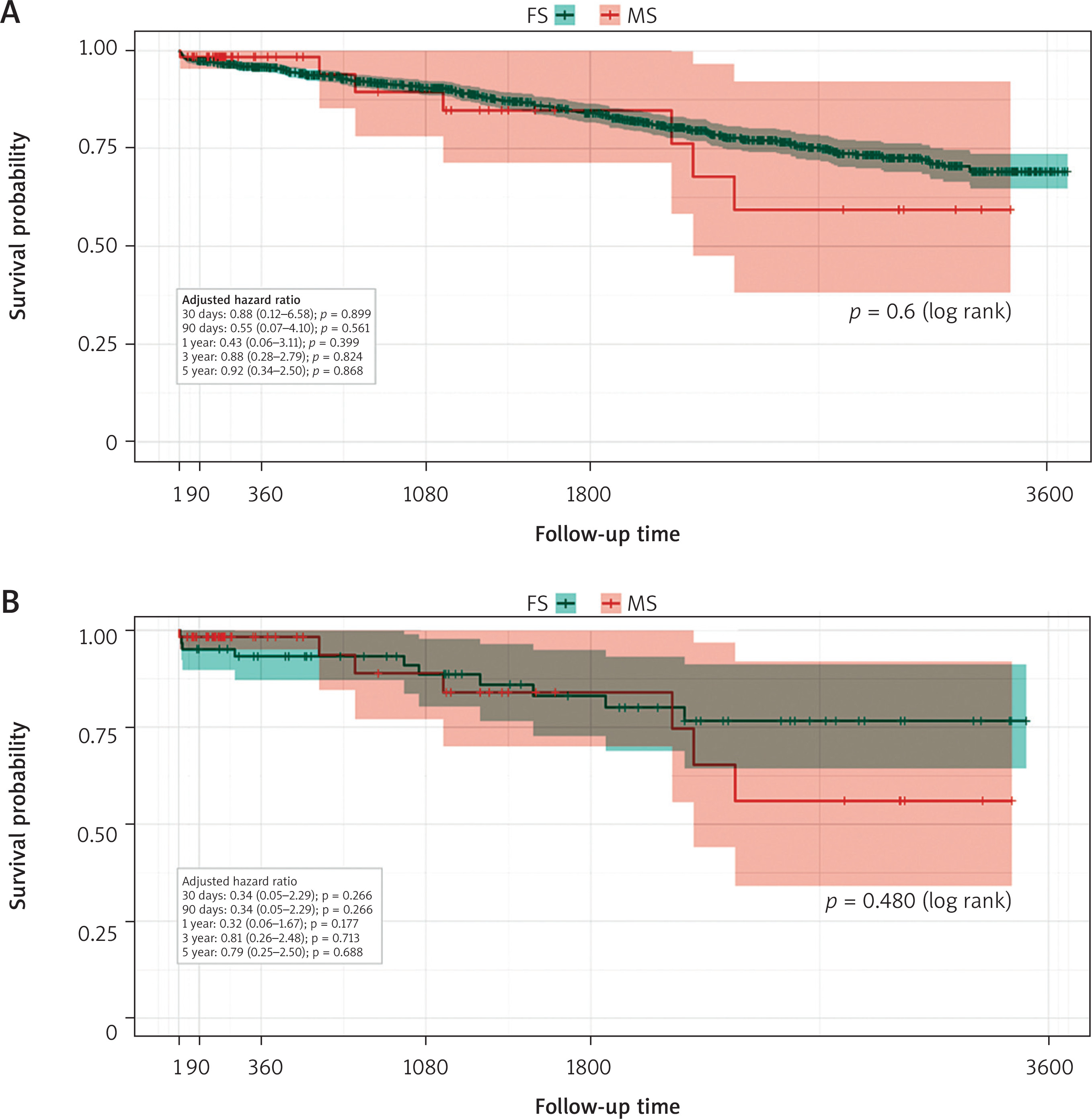 Analysis of key endpoints revealed no statistically significant difference in survival between the MS and FS groups (log rank = 0.6, stratified logrank after PSM = 0.48). The primary endpoint analysis, a multivariable clustered Cox regression on the matched cohort, reinforced these findings (Table V). Early mortality was minimal across the study, with only a single event noted in the unmatched cohort and zero events in either group after propensity score matching. This lack of a significant difference persisted at the 30-day follow-up, both in the initial unmatched cohort (1.6% for MS vs. 2.0% for FS; aHR = 0.88; p = 0.899) and in the propensity score-matched cohort, with non-significantly lower mortality in MS (1.7% vs. 4.9%; aHR = 0.34; p = 0.266) (Table VI).