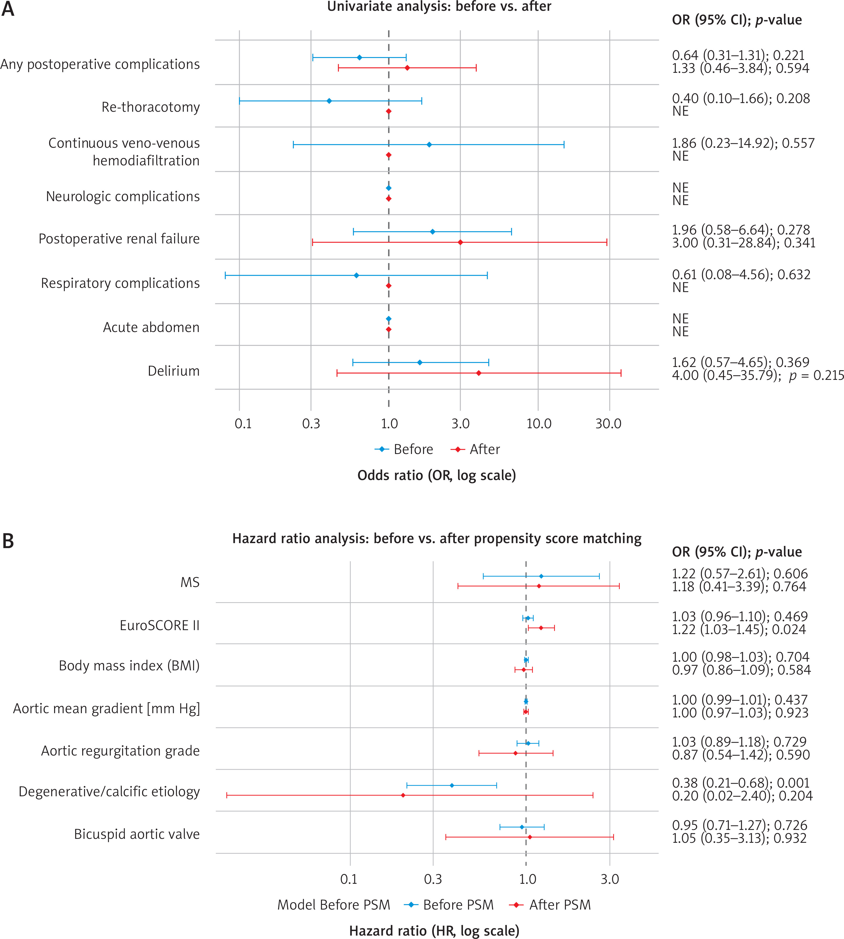 Analysis of the unmatched groups revealed longer procedural times for the MS approach. Cardiopulmonary bypass (CPB) time was significantly longer (median: 71 vs. 63 min; p = 0.005), while the difference in aortic cross-clamp time (median: 55 vs. 50 min; p = 0.064) was not significant (Table III). The incidence of postoperative complications was not statistically different between the groups at baseline despite postoperative bleeding, which was, both before (520 ml vs. 460 ml, p = 0.054) and after propensity score matching (600 ml vs. 460 ml, p = 0.052), lower in the MS compared with the FS group (Figure 1 A, Table IV). One patient required conversion when significant bleeding occurred 4 h after the operation from the musculo-phrenic artery, which could not be controlled from the ministernotomy access.