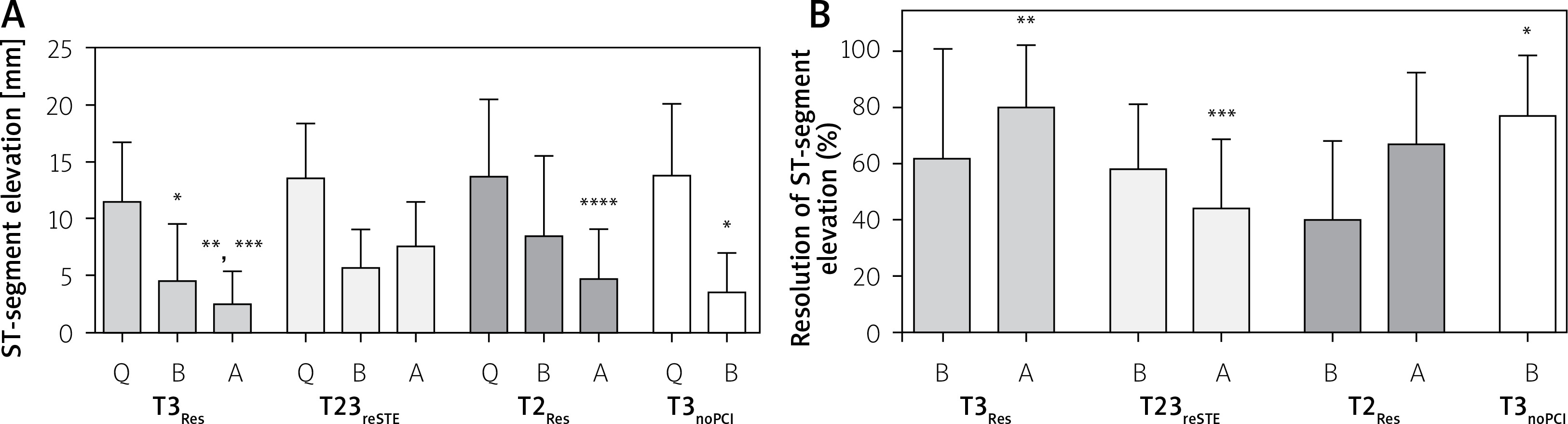 Data are shown as mean and standard deviation. Q, B, A – ECG recorded at first medical contact, before and after PCI, respectively. T2Res – TIMI-2 flow with ST-segment resolution following PCI, T23reSTE – TIMI-2/3 flow with ST-segment re-elevation following PCI, T3noPCI – TIMI-3 flow without PCI, T3Res – TIMI-3 flow with ST-segment resolution following PCI. *P < 0.05 vs. B-T2Res, **p < 0.001 vs. A-T23reSTE, ***p < 0.05 vs. A-T2Res, ****p < 0.05 vs. A-T23reSTE.