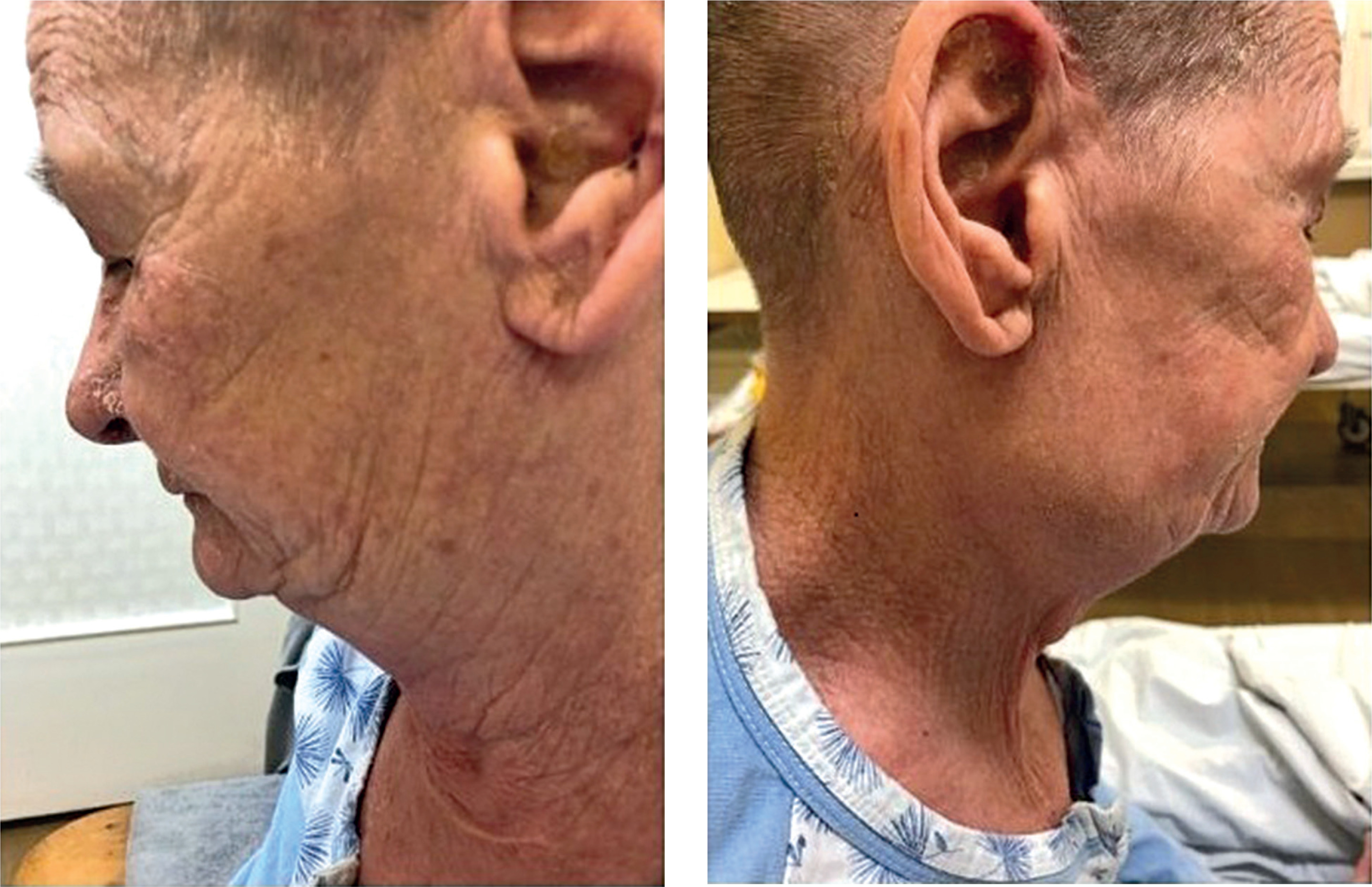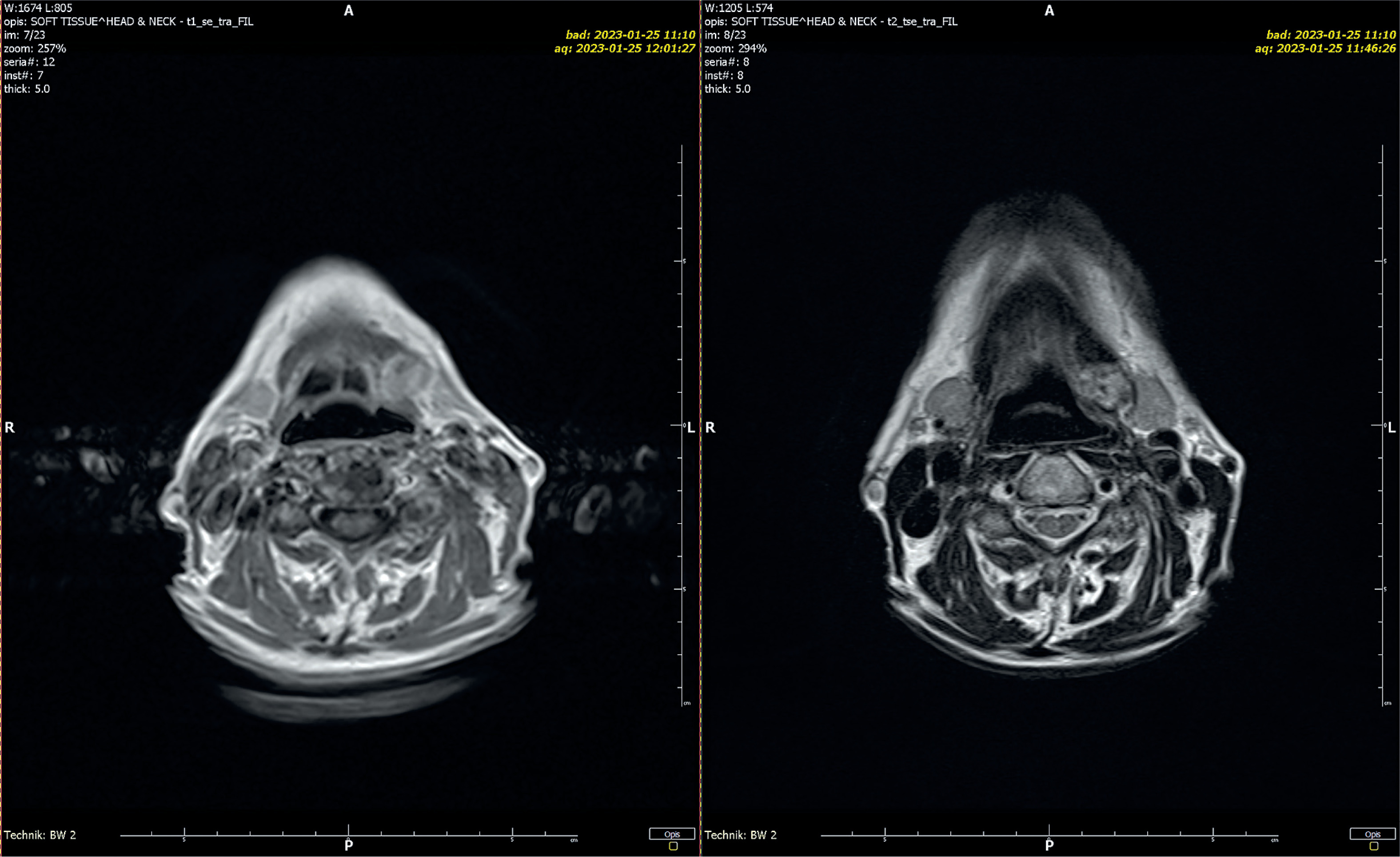 A 72-year-old female patient was admitted to the Dermatology Department due to sudden onset of widespread rash and the eruption of primary, sterile, macroscopically visible pustules on non-acral skin following a recent neurosurgical procedure. The patient’s condition was complicated by elevated inflammatory markers (white blood cells (WBC) = 12.79 × 10³/µl, C-reactive protein (CRP) = 27.7 mg/dl) and decreased levels of both total (7.96 mg/dl) and ionized calcium (0.87 mmol/l), as revealed by laboratory tests. The patient had a history of generalized pustular psoriasis with periods of remission and exacerbation. Based on the clinical presentation of the skin lesions, medical history, additional test results, and the diagnostic criteria established in 2017 by the European Rare and Severe Psoriasis Expert Network (ERASPEN) (which include primary sterile pustules visible on non-acral skin, systemic inflammation, and a recurrent disease course), an exacerbation of GPP was diagnosed. Given the severity and progression of the skin lesions, as well as the patient’s overall deteriorated condition, a comprehensive treatment approach was initiated. Based on the clinical status, drug availability, and expert recommendations, treatment with acitretin and glucocorticosteroids was introduced. Acitretin was administered at an initial dose of 20 mg/day (0.5 mg/kg), and methylprednisolone at 8 mg/day. A rapid and favorable clinical response was observed, with marked reduction of pustular lesions. However, on the fifth day of pharmacotherapy, the patient developed notable bilateral swelling in the submandibular and preauricular regions (Figure 1). This swelling was firm and accompanied by a mild increase in inflammatory markers (WBC = 15.95 × 10³/µl, CRP = 5.1 mg/dl). An ultrasound examination confirmed inflammation in all salivary glands, with no evidence of enlarged lymph nodes in cervical regions. In response to these findings, an otolaryngology consultation was obtained. Common inflammatory and postoperative infectious causes, including mumps, were excluded, and serologic testing yielded negative results. Additional serologic tests were performed for cytomegalovirus, Epstein-Barr virus, and bacterial pathogens; all results were negative. Autoimmune markers, including ANA and anti-SSA/SSB antibodies, were negative, thereby excluding Sjögren’s syndrome and other related connective tissue diseases. Throughout the hospitalization, the patient received optimal intravenous and oral fluid therapy. Considering the clinical presentation, the findings of the otolaryngology consultation, and a comprehensive review of the patient’s medications, an adverse reaction to acitretin was suspected. Given the diagnosis, acitretin was discontinued, while glucocorticosteroid therapy was continued. This adjustment led to the resolution of the swelling and other symptoms. A follow-up ultrasound examination conducted 5 days after acitretin discontinuation revealed that the inflammation in the salivary glands had completely subsided. Magnetic resonance imaging performed 7 days after the episode revealed symmetrical parotid and submandibular glands without focal lesions (Figure 2). To further the diagnostics, a salivary gland biopsy was performed, yielding a histopathological result of groups and clusters of salivary gland cells with a monomorphic appearance in acinar arrangements. No nuclear atypia was observed. Numerous macrophages and microcalcifications were present in the background. The cytological findings did not support a diagnosis of neoplastic proliferation.