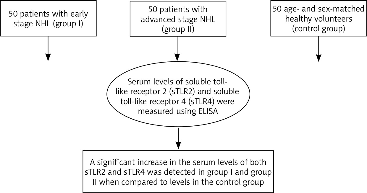 Therefore, the present study aimed to assess the serum levels of sTLR2 and sTLR4 in a group of patients with NHL along with a group of healthy control volunteers and to investigate their correlations with the laboratory and clinicopathological parameters of these patients.