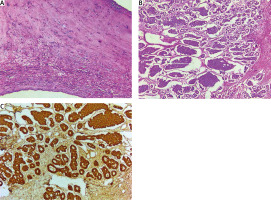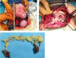 A 64-year-old female patient was referred to our unit in September 2019 complaining of dyspnea on minor physical exertion, limb swelling, flushes and diarrhea 6 months prior to admission. Holter monitoring revealed sinus rhythm with frequent ventricular arrhythmia (7754 ventricular extrasystoles). Transthoracic echocardiography (TTE) showed mild regurgitation of the aortic valve, mitral valve and pulmonary artery valve (PV), severe tricuspid valve (TV) regurgitation, right ventricle enlargement, left ventricular ejection fraction of 68%, tricuspid annular plane systolic excursion (TAPSE) of 20 mm, right ventricular ejection fraction of 41%, systolic pulmonary artery pressure of 33 mm Hg, with enlargement of the pulmonary artery. Cardiac magnetic resonance imaging confirmed right ventricle enlargement (4 × 3.8 cm/m2, end-diastolic volume – 257 ml, end-systolic volume –150 ml), right ventricular ejection fraction was 41%. Ovarian tumor was revealed 2 months prior to admission to our hospital when computed tomography showed uterus enlargement (57 × 68 × 63 mm) and two cystic-solid tumors 140 × 150 × 85 mm and 95 × 60 × 75 mm in place of right and left ovaries, respectively. Laboratory findings included elevation of tumor markers CA-125 – 136.3 (N: 0–30) (U/ml), CEA – 4.24 (N: 0–3.8) (U/ml), CA-15-3 – 27.1 (N: 0–22) (U/ml), as well as the nonspecific NET marker chromogranin A – 706.9 ng/ml (N: 0–100). CS was diagnosed and after multidisciplinary discussion with the oncology team it was decided to perform simultaneous TV replacement and panhysterectomy. The patient received intravenous octreotide in the dose of 50 µg/h starting from 6 hours preoperatively. Abdominal surgery (panhysterectomy) was performed through lower midline incision. Ovaries (left: 60 × 70 mm, right: 120 × 150 mm) had solid and tuberous structure. Upon completion of abdominal intervention cardiac surgery was performed via median sternotomy. At revision, fibrosis, retraction and reduced mobility of TV leaflets were found. TV was replaced with an Edwards Perimount Magna 27 mm bioprosthesis (Figure 1). Cardiopulmonary bypass time was 82 minutes, myocardial ischemia time was 50 minutes. Octreotide infusion was continued intraoperatively in the same dose, which provided stable hemodynamic parameters within normal values. The patient was extubated after 11 hours but remained in the intensive care unit for 6 days due to moderate respiratory failure and unstable hemodynamics that required continuous infusion of norepinephrine and milrinone. Intravenous octreotide was continued in the dose of 25 µg/h during the first three postoperative days (POD). After the surgery the patient developed atrial fibrillation paroxysm and cardiac tamponade, which were successfully treated. On POD 10 she also developed neurological deficit and was diagnosed with ischemic stroke. The stroke was managed conservatively and at the time of the discharge neurological symptoms has resolved. Embolic material was thought to originate from carotid arteries that had a degree of atherosclerosis with stenoses up to 30% on carotid ultrasound. TTE on POD 7: aortic valve, mitral valve and PV and tricuspid bioprosthesis – mild regurgitation without stenosis, systolic pulmonary artery pressure – 36 mmHg, LVEF – 61%, RVEF – 44%. Chromogranin A on POD 11 declined to 132.0 ng/ml. Positron emission tomography with 18F on POD 26 revealed no metabolic-active tumors or metastases. The patient was discharged on POD 36 in a satisfactory general state. Histopathological examination confirmed ovarian carcinoid, insular type (Figure 2). Immunohistochemical results were as follows: CK (AE1/AE3), synaptophysin and chromogranin A were positive; calretinin and α-inhibin were negative. The positive index of Ki67 was < 3%. The patient received no chemotherapy. Single photon emission computed tomography (SPECT/CT) with 99mTc-Tektrotyd was performed 1 year after surgery: no metastatic lesions were detected. During follow-up at 18 months after surgery, abdominal and pelvic magnetic resonance imaging with late gadolinium enhancement were performed: no abnormalities were detected. TTE revealed mild aortic valve, mitral valve and PV regurgitation, tricuspid bioprosthesis – trace regurgitation with effective orifice area 3 cm2, mean gradient 5 mm Hg. Chromogranin A further declined to 42.7 ng/ml. 30 months after surgery the patient was in good health and had class II heart failure according to the NYHA classification. The patient was physically and socially active with a good quality of life.