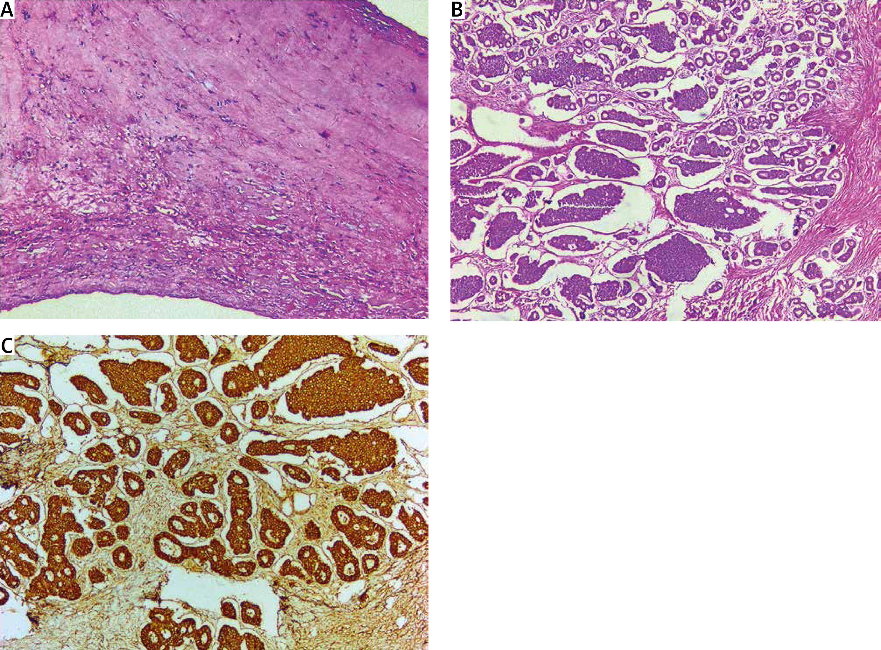 Histological examination. A – TV leaflet – focal fibrosis, hyalinosis, reactive lymphoid infiltration (hematoxylin and eosin staining, 50×); B – ovarian tumor – insular pattern (hematoxylin and eosin staining, 100×); C – ovarian tumor – diffuse intense immunoreactivity of chromogranin A (immunohistochemical staining, 100×)