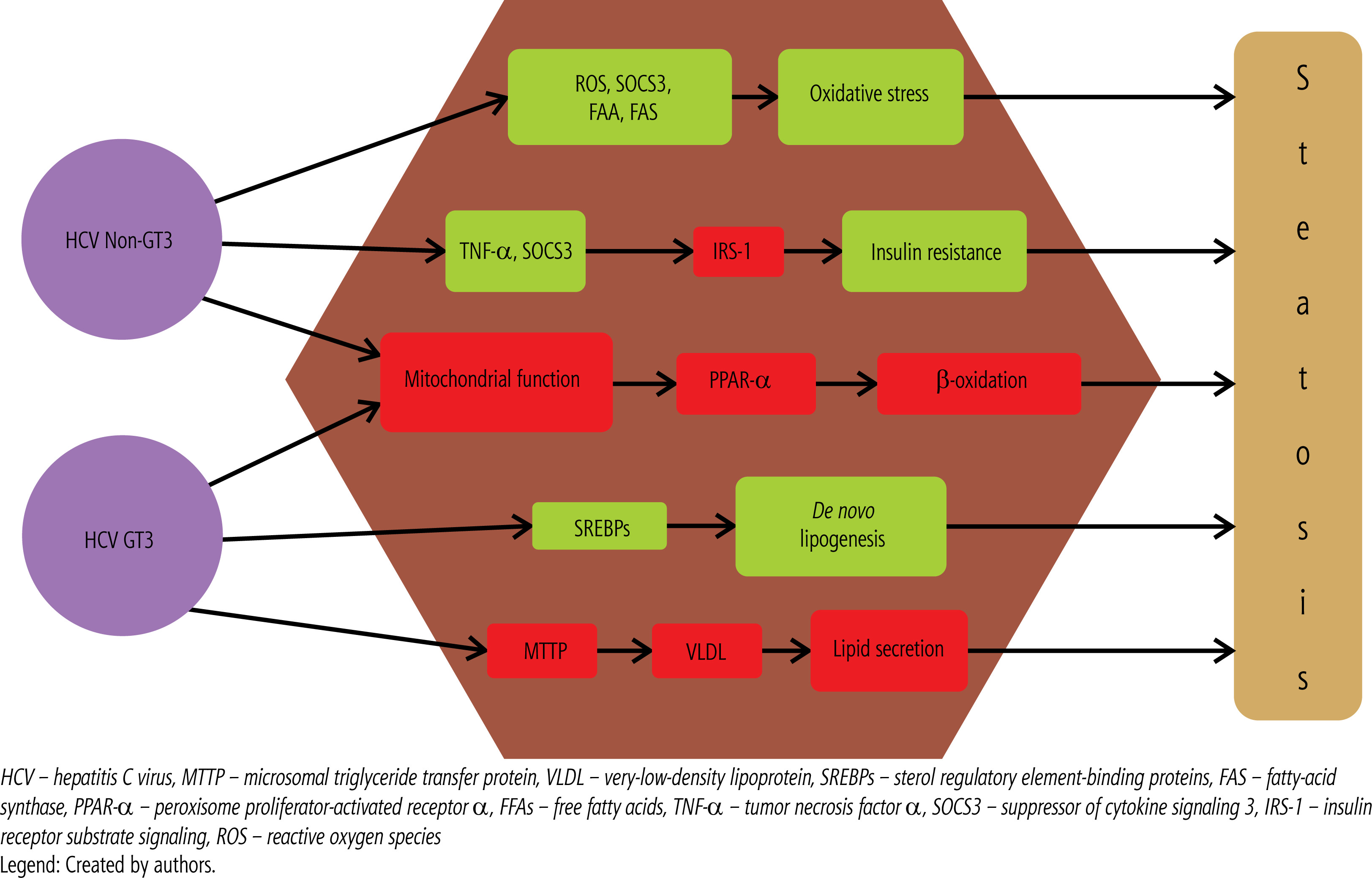 The development of hepatic steatosis in patients with CHC is determined by numerous risk factors, which can be broadly divided into viral and metabolic factors (Table 1). Steatosis associated with viral factors is mainly the result of direct effects of HCV, especially genotype 3, on lipid metabolism [11]. Figure 3 presents the main molecular mechanisms by which HCV induces steatosis, depending on the genotype. Steatosis associated with host metabolic disorders results from the influence of factors such as insulin resistance, obesity, and diabetes. However, these two forms of steatosis are not completely separate and often coexist, leading to complex interactions that make it difficult to determine their individual impact on liver disease progression [11].