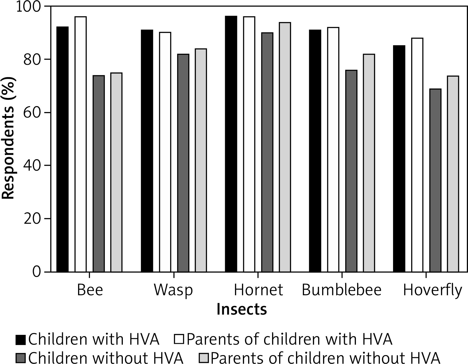The differences between insects in the percentage of their correct identification by all study participants were also statistically significant (p < 0.001). The most frequently recognized insect in all groups was the hornet (up to 96.1% in children with HVA), whereas the least identified one was the hoverfly (down to 69.1% in children without HVA). In each group (children with HVA and their parents, children without HVA and their parents), the percentage of participants correctly identifying the insect varied depending on the kind of insect (p = 0.024, p < 0.001, p < 0.001, p = 0.018, respectively) (Figure 2).