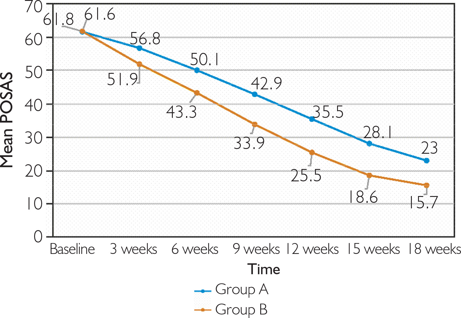 Mean baseline POSAS was 61.6 ±10.4 in Group A and 61.8 ± 8.2 in Group B (p = 0.922) (fig. 1). At 3 weeks, none of the patients achieved more than 50% improvement (good clinical response) in either group. Approximately 2.4% of the patients in Group A and 23.5% of the patients in Group B demonstrated a fair clinical response (25–50% improvement). At 6 weeks, 11.8% of the patients in Group B achieved a good clinical response, as compared to none of the patients in Group A. Poor response was seen in 61.9% of the patients in Group A and 4.7% of the patients in Group B.