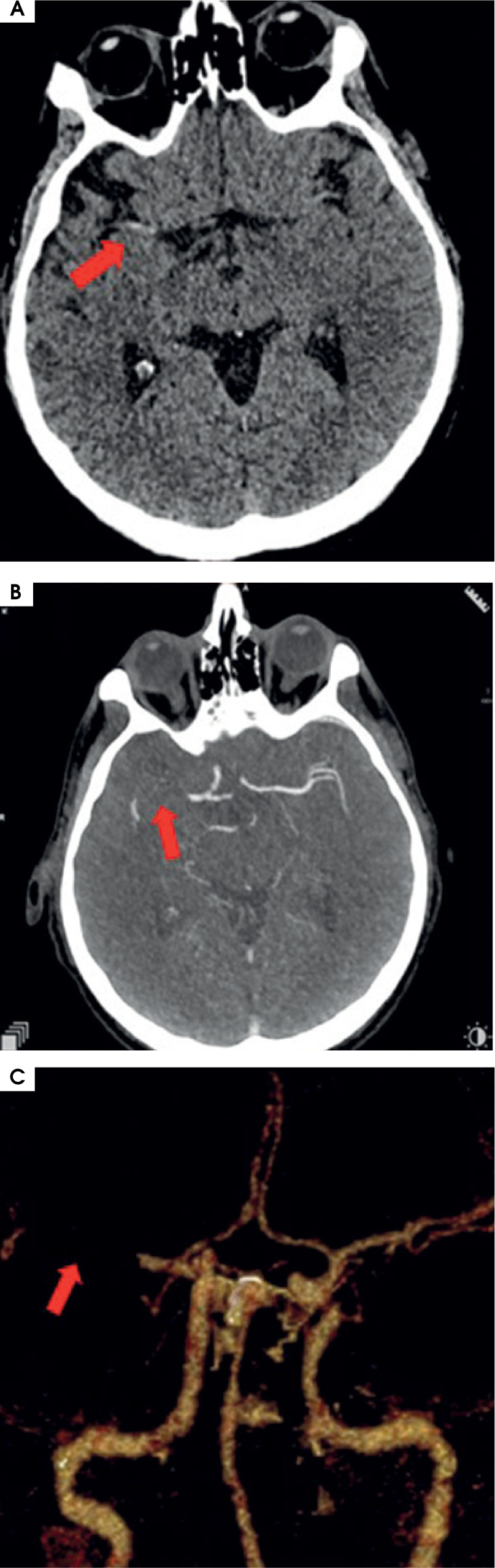 A) Computed tomography without contrast – hyperdense right middle cerebral artery (RMCA). B) Angio-CT – occlusion of RMCA in M1/2 segment. C) VRT (volume rendering technique). Arrows show pathological lesions