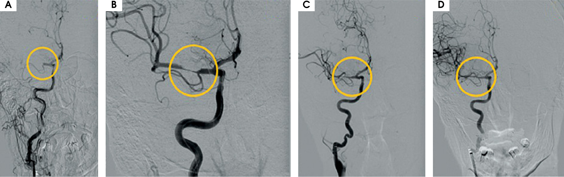 A) Right middle cerebral artery (RMCA) occlusion: 7 mm from its ostium from the right internal carotid artery – TICI 0. B) Mechanical thrombectomy performed twice using stent retriever Solitaire X 6 × 40 mm – branches of RMCA are opened, still present thrombus which narrowing lumen of RMCA in segment M1. C) After first aspiration of thrombus (catheter – ACE68). D) After second aspiration of thrombus – final result TICI 3