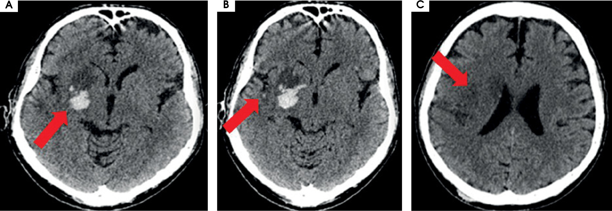 Scans from control computed tomography of the brain performed the day after the procedure of thrombectomy. A) On the right side of the brain, in deep structures, hyperdense haemorrhagic foci are seen, with the greatest one 20 × 21 × 15 mm and a smaller satellite. B) Surrounding the M1/M2 segment of right middle cerebral artery, probably minor subarchnoid haemorrhage in the lateral sulcus on the right side is present. C) Acute ischemic lesions located cortico-subcortically in the right hemisphere, including part of the frontal, occipital, and temporal lobe and also thalamus, the islet, caudate nucleus, mass effect is present as a narrowed frontal horn of the right ventricle and a narrowed sulcus above the area of stroke