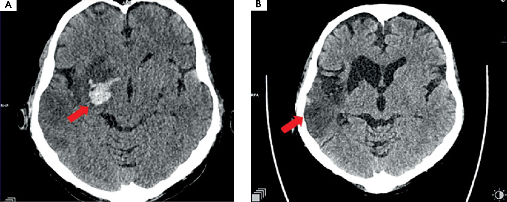 After MT the blood flow in the artery was returned with TICI 3 (Figure II). The day after the MT, control CT showed haemorrhagic foci (Figure III). The patient returned to the ICCU three days later. His neurological status was the same as before the MT of RMCA. In repeated CTs of the brain, haemorrhagic foci were still present (Figure IVA). In the following days of hospitalization, the resolution of haemorrhagic and evolution of ischemic cerebral lesions were observed (Figure IVB).