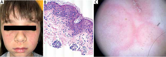 Herein we present the case of lupus erythematosus tumidus in childhood with head and neck involvement, successfully treated with chloroquine. An 8-year-old female patient was admitted to the Dermatology Ward because of recurrent skin changes on the face and arms that have presented as well-demarcated and indurated pink plaques on the face (mainly the cheeks, eyelids and the right side of the forehead) resembling erythematous-exfoliating rings with a clearly defined, rounded dark pink edge (Figure 1 A). Dermoscopy revealed blurry linear-irregular/reticular vessels along multifocal whitish areas over a pinkish background and whitish bright areas over a reddish/purple background with or without dotted/linear-irregular vessels and haemorrhagic spots (Figure 1 C). Appearance of lesions was not accompanied by fever or prodromal symptoms. These skin changes first appeared during spring approximately 12 months prior to the hospital admission, the onset of lesions was related to sun exposure. When skin changes appeared for the first time, they resolved spontaneously without treatment after about a week. Subsequent recurrences of similar skin lesions occurred three more times, during the summer months, for the last time a week prior to hospital admission. The patient had a family history of psoriasis and no chronic comorbidities. She had no cutaneous lesions elsewhere and no clinical eye symptoms and systemic findings. Laboratory investigations, including complete blood cell count, erythrocyte sedimentation rate (ESR), liver tests and urine tests, were within reference values. The antinuclear antibody (ANA) indirect immunofluorescence assay was negative. Scrapings from lesions for mycological examinations were taken and results were negative.