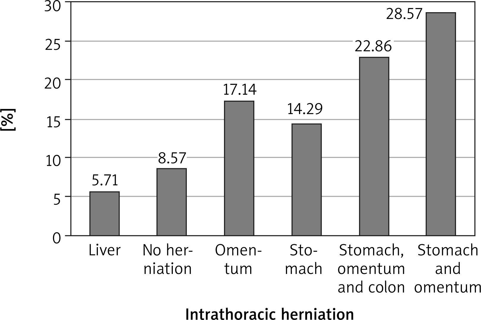 Clinically, diagnosis of TDR is difficult since there are no specific clinical symptoms and signs for diaphragmatic rupture [11]. However, there may be complaints of epigastric or hypochondriac pain with dyspnoea. Features associated with the acute phase of diaphragmatic rupture as reported by Shah et al. may include non-specific abdominal pain, especially in the left upper quadrant or shoulder tip pain. It may be accompanied by dyspnoea, orthopnoea or cyanosis and hypotension in the event of massive herniation with mediastinal shift [12]. In the latent phase, otherwise known as the interval phase, symptoms such as left upper quadrant pain or features of intermittent intestinal obstruction, especially following meals, which tend to resolve with belching, passing flatus or vomiting, may be experienced in some patients [3, 12]. The obstructive phase symptoms include features of intestinal herniation and obstruction with possible strangulation. It may include vomiting (projectile in gastric outlet obstruction), nausea and severe abdominal pain. In the event of a possible strangulation and intra-thoracic bowel perforation, there may be complaints of pleuritic chest pain with feco-pneumothorax and pleurisy [10]. Similar to Ganie et al., who reported 2 cases of diaphragmatic injury with colonic herniation and perforation into the thoracic cavity [17], 2 of our patients sustained left diaphragmatic rupture with intrathoracic gastric perforation and the repairs of the perforation were done in the chest before reducing the stomach back into the abdomen. One of these patients had extensive mediastinitis with frozen thoracic cavity because of delayed diagnosis after initially missing the rupture during an earlier exploratory laparotomy, but the patient survived. The most commonly herniated intrathoracic intestinal organ was the stomach, involving 24 cases, with the stomach being the only herniated organ in 3 of the cases in our series, as shown in Figures 4 and 5. Five patients had no intrathoracic viscus/organ herniation. Auscultation of bowel sounds in the lower lung zones with dull percussion note may also be suggestive of a possible diaphragmatic rupture with bowel herniation [7, 10, 13]. The preoperative diagnosis of most of our patients was of clinical suspicion, with the most common imaging done being chest X-ray. Few patients who were initially stable and had concomitant abdominal signs had CT scan of the chest and the abdomen done. The woman with a right diaphragmatic rupture from vehicular knockdown had confirmation of the diagnosis by CT scan.