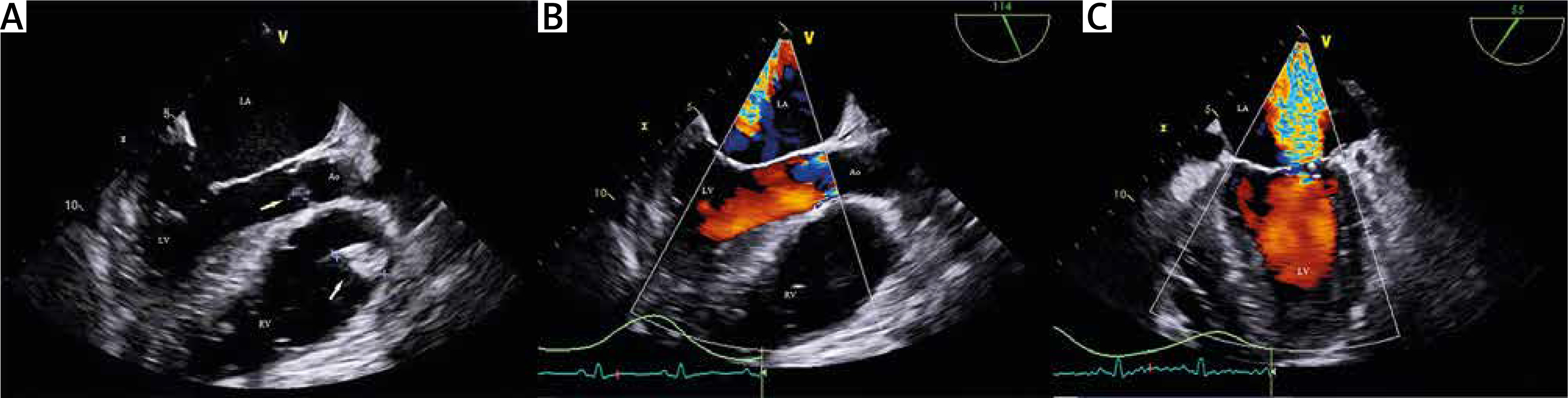 Transesophageal echocardiography examination: A – TEE revealed small vegetation on the aortic valve (yellow arrow) and more extensive vegetation on the pulmonary valve with protrusion into the RV. B – TEE colour Doppler examination revealed severe aortic valve regurgitation. C – TEE colour Doppler examination revealed severe mitral valve regurgitation