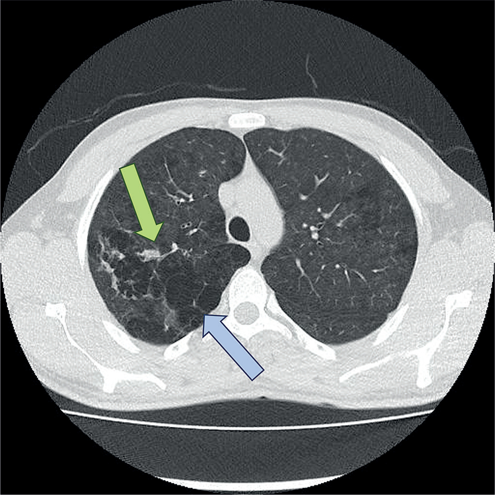 Computed tomography (CT) image demonstrating emphysematous lung parenchyma (blue arrow) and the bleeding site in the bronchial artery (green arrow), identified as the source of hemoptysis