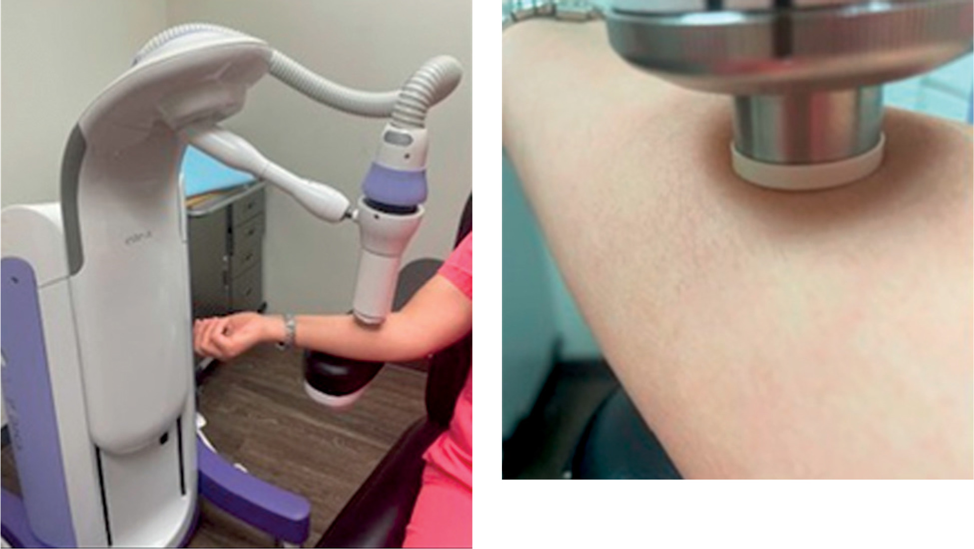 The Esteya device (Figure 1) consists of a treatment unit, laptop with planning software, and treatment control panel. The unit can be positioned over most any site on the body. X-rays produced by the Esteya device have a peak energy of 69.5 kVp. The device’s high-dose-rate radiation delivery (2.7 Gy per min) at 3 mm depth yields treatment times of approximately three minutes per fraction. The output field of X-ray source can be modified to match the tumor size using a surface applicator that functions as a collimator. There are different sizes of surface applicators available (range, 10-30 mm) to allow treatment of tumors up to 20 mm diameter, with an appropriate margin.