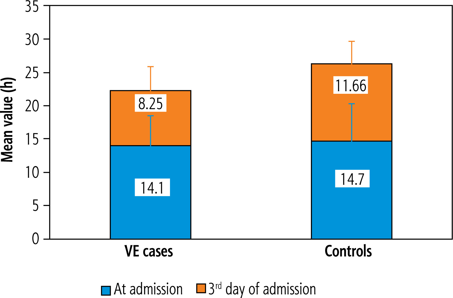 There were no statistically significant differences between the studied groups regarding age (p = 0.831), sex (p = 0.360), body weight (p = 0.120), mode of delivery (p = 0.064), and gestational age in weeks (p = 0.754) and nutrition status (p = 0.846), but weight loss was significantly higher among VE cases (280 ±30.76) than controls (180.11 ±45.29) (p = 0.014) (Table 1). There were no statistically significant differences between the studied groups regarding heart rate (p = 0.960), respiratory rate (p = 0.750) and temperature (p = 0.858) (Table 2). Phototherapy exposure was statistically significantly lower among VE cases (75.9 ±8.95) than controls (94.70 ±15.42) with a p-value = 0.004 (Fig. 3). There were no statistically significant differences between the studied groups regarding hemoglobin (p = 0.733), total leucocyte count (p = 0.080), platelets (p = 0.056) and C-reactive protein (p = 1.00) (Table 3).