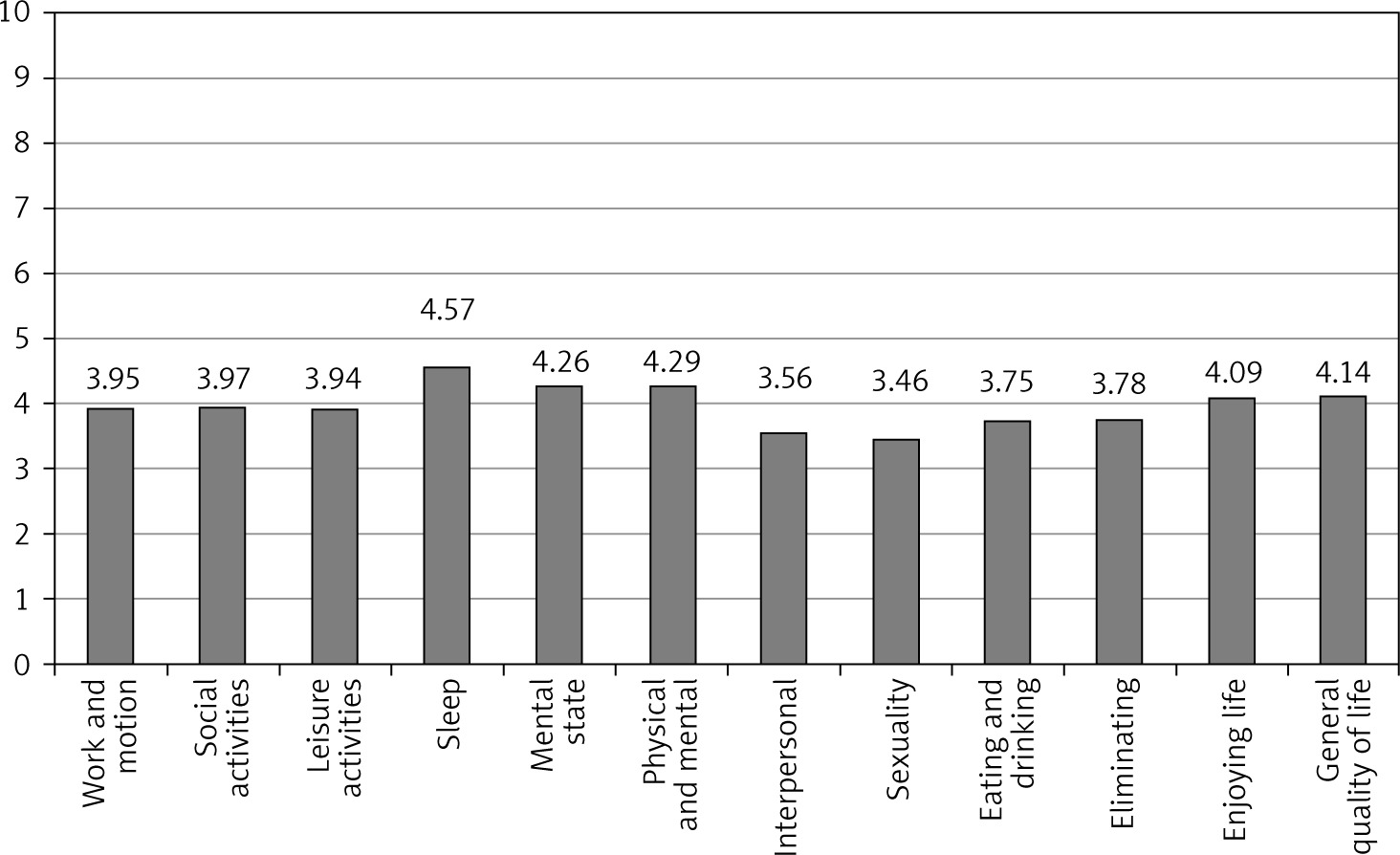 The effect of menopause symptoms experienced by women on daily life activities stated according to VAS with points 0–10 determined that the most affected daily life activities were sleep (4.57 points), physical and mental exhaustion (4.29 points), mental state (4.26 points), general quality of life (4.14 points), enjoying life (4.09 points), and social activities (3.97 points) (Fig. 1).