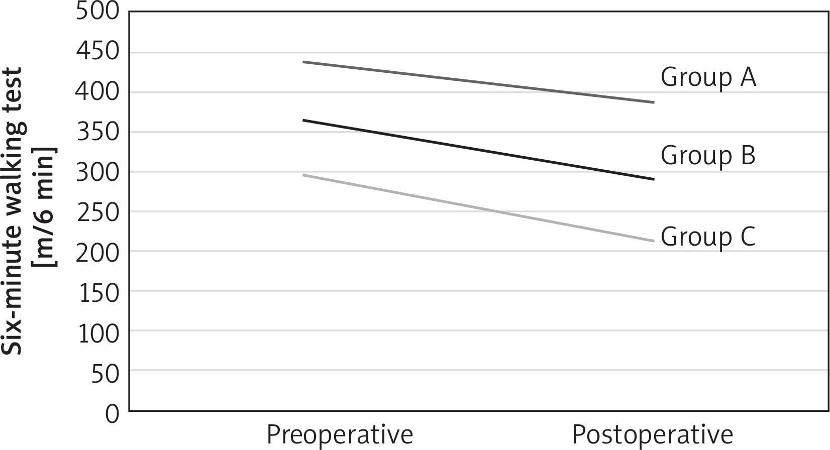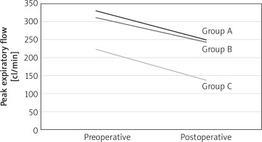 Preoperative and postoperative PEF values were significantly better in the two groups of treated patients in comparison with group C. As shown for the 6MWT, also the decrease of PEF value in the postoperative period was significantly lower in the treated groups of patients (Fig. 2, Table III).