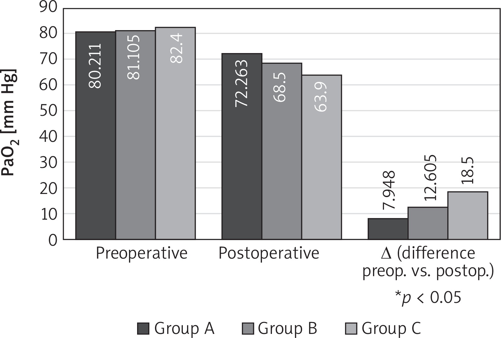 Oxygen partial arterial pressure (PaO2) in blood, comparison between group A, B, C, preoperatively and postoperatively