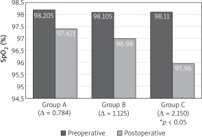 Oxygen arterial saturation (%) in blood, comparison between group A, B, C, preoperatively and postoperatively
