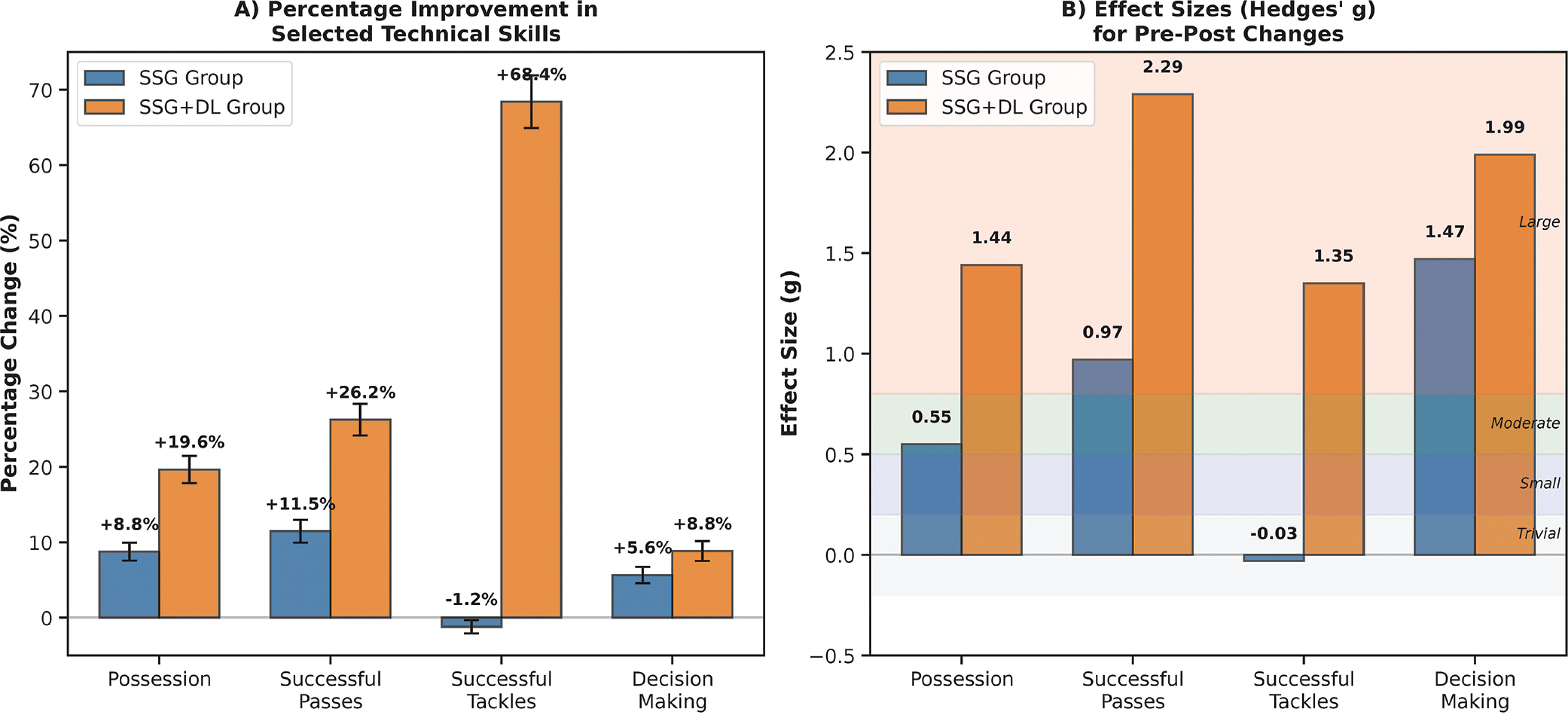 Panel A displays the percentage improvement from pre-test to post-test for both training groups across four critical performance indicators: possession maintenance, successful passing execution, successful tackling, and decision-making capacity. Error bars represent standard error of the mean. Panel B presents the corresponding effect sizes (Hedges’ g) for each metric, with values interpreted as trivial (0–0.2), small (0.2–0.5), moderate (0.5–0.8), and large (> 0.8). The SSG + DL group demonstrated consistently greater improvements across all metrics, with particularly notable enhancements in successful tackling (68.41% improvement, g = 1.35) compared to the SSG-only group (-1.22% change, g = -0.03).