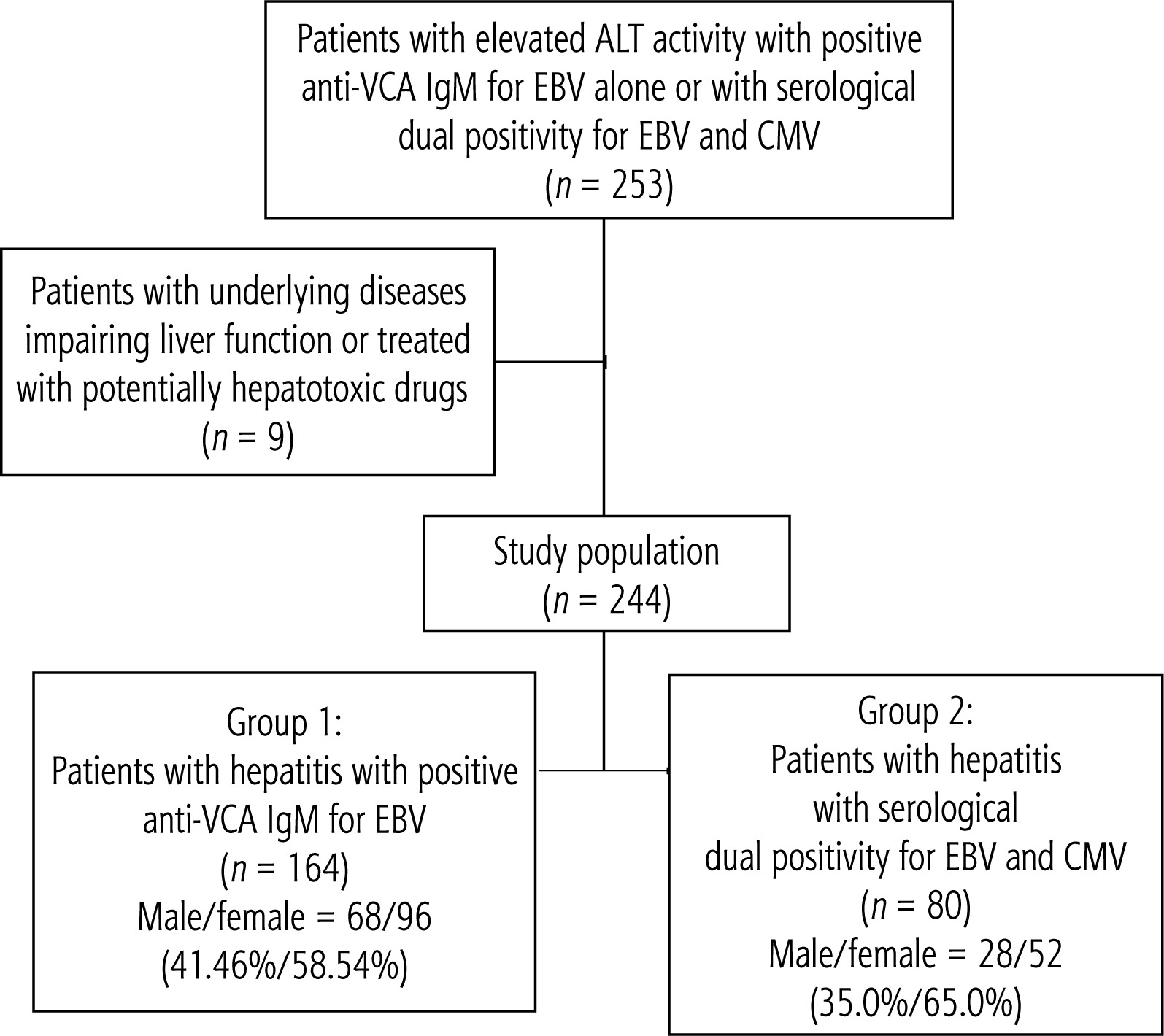 We performed a retrospective analysis of the medical records of 253 pediatric patients who were hospitalized due to hepatitis with increased ALT activity in the course of EBV infection with or without positive IgM for CMV. Nine patients (3.55%) were excluded from the study because of underlying diseases associated with impaired liver function or potentially hepatotoxic drug therapy. For the study, we recruited 244 children and adolescents aged 0-18 years and divided them into two groups. The first cohort consisted of 164 patients (67.21%) with hepatitis during EBV infection (the male-to-female ratio was 1 : 1.41). In the second group of 80 (32.79%) children with increased ALT activity due to EBV infection with positive IgM for CMV, the male-to-female ratio was 1 : 1.86. The enrollment of patients in the study is presented in the flowchart (Fig. 1).