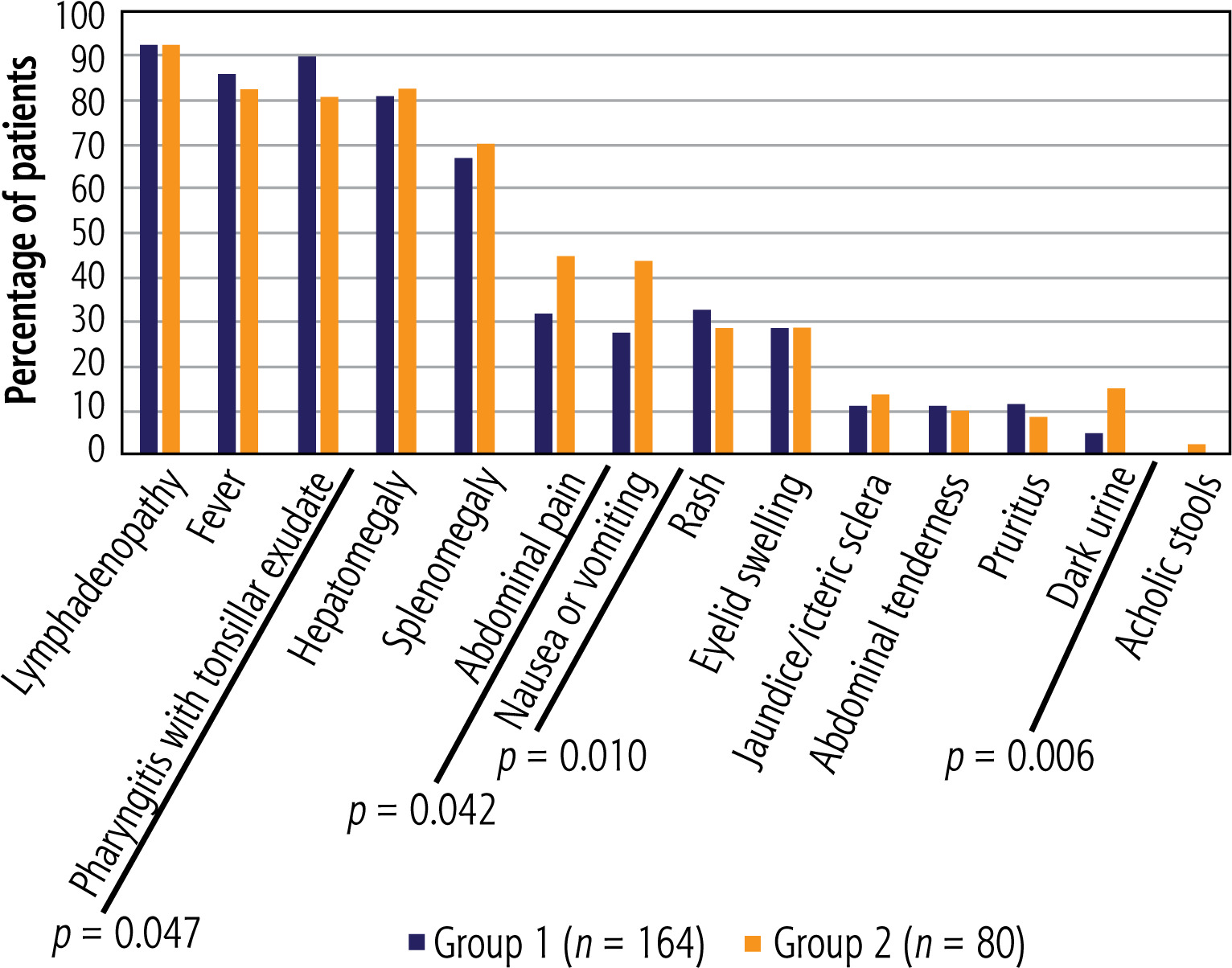 The frequency of other symptoms of mononucleosis syndrome did not differ significantly between the study groups. Figure 2 shows the frequency of IM symptoms in both cohorts.