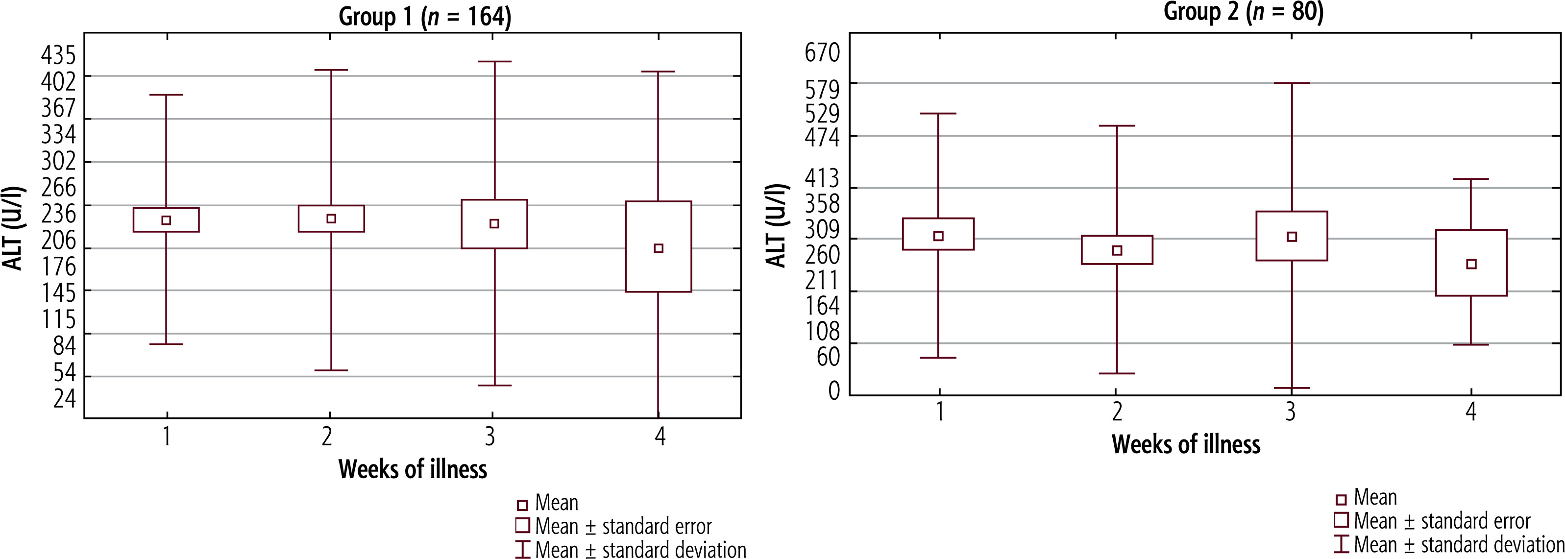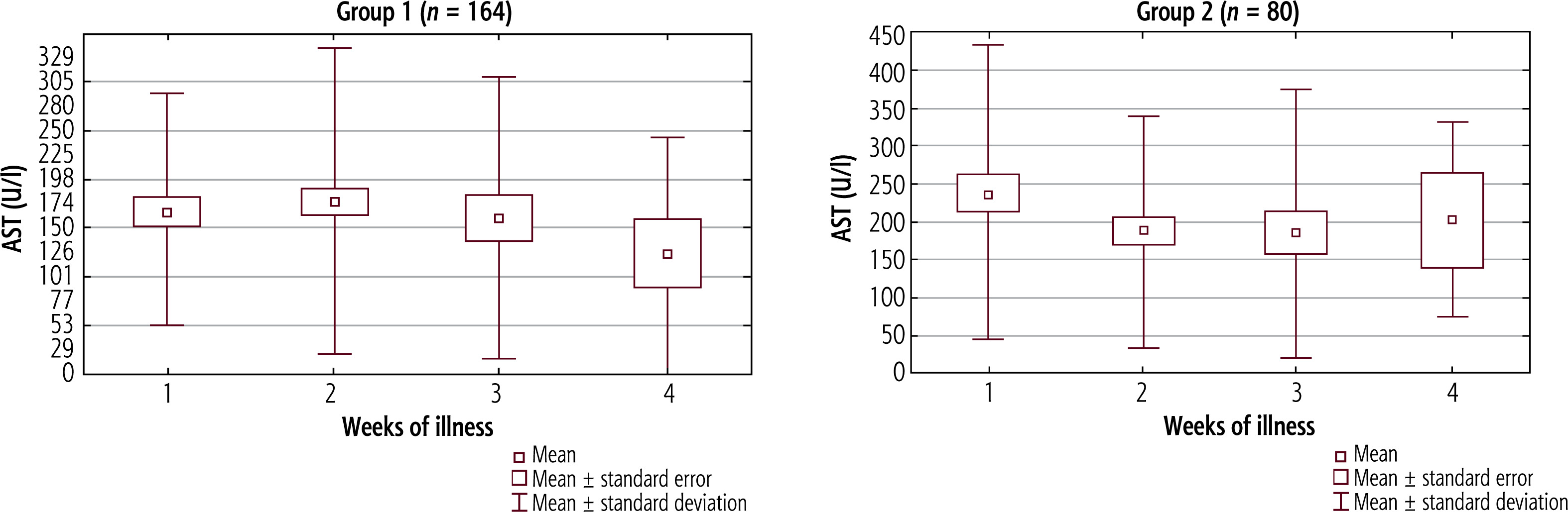 Aspartate aminotransferase activity in the serum did not significantly differ between successive weeks of disease in either study group (Fig. 4). In the first group, AST values were highest in the second week of illness, with a decreasing trend in the third and fourth weeks. In the second group, the highest AST levels were observed during the first and fourth weeks. However, AST activity was significantly higher in the second group only in the first week (p = 0.023). The values of AST in the serum in successive weeks of illness in both study groups are presented in Table 4.