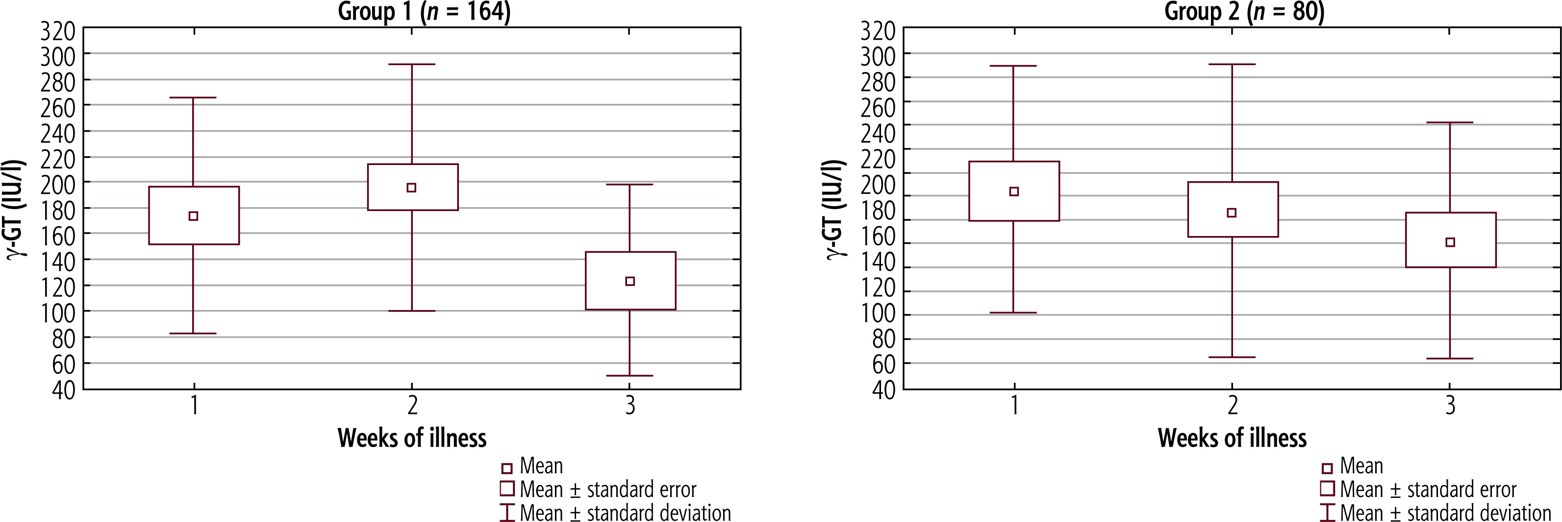 Analysis of γ-GT revealed the highest activity in the first group in the second week of the disease and in the second group in the first week (Fig. 5). In both cohorts, the differences between the successive weeks were not statistically significant (although in Group 1 the p-value reached 0.082). In the second week the activity of this enzyme showed a non-significant difference between groups (p = 0.091). The values of γ-GT activity in the serum in successive weeks of illness in both study groups are presented in Table 5.