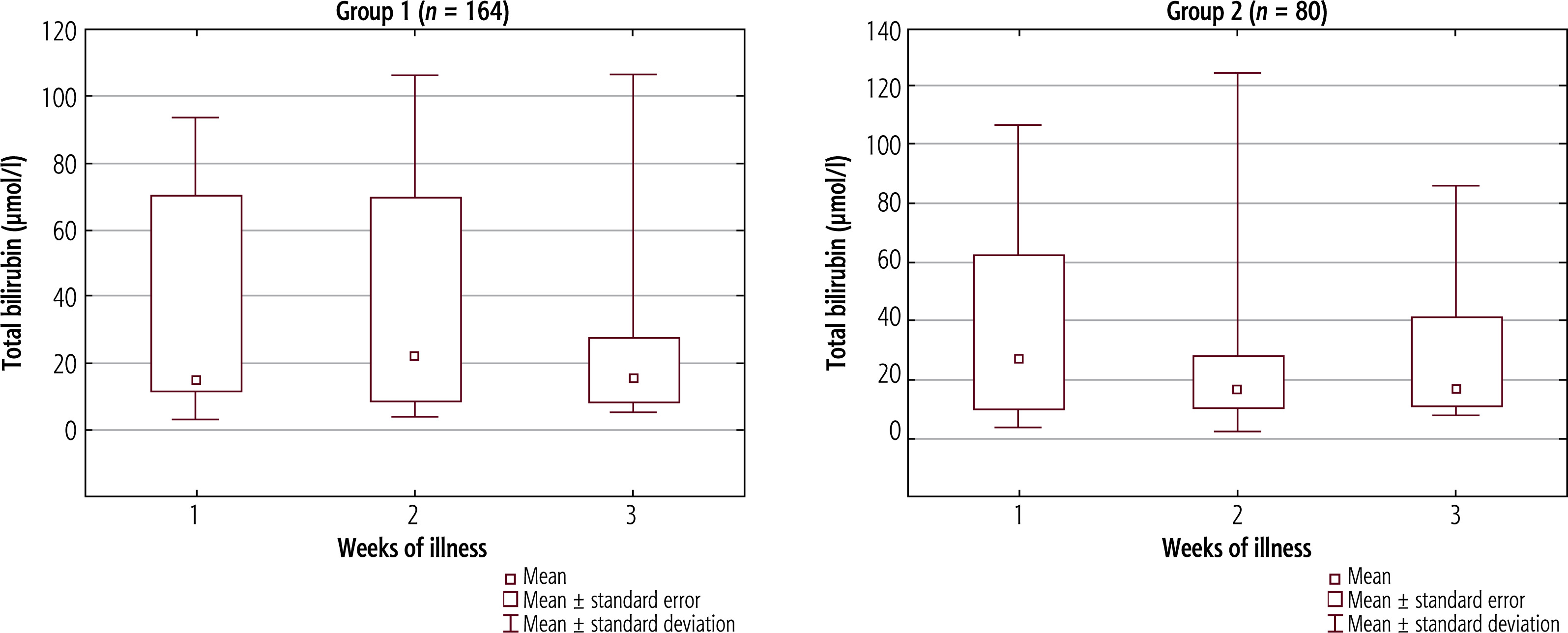 Mean total bilirubin serum concentration (±SD) in successive weeks of hepatitis in Group 1, p = 0.698, and Group 2, p = 0.769. The Kruskal-Wallis test was used for changes over time