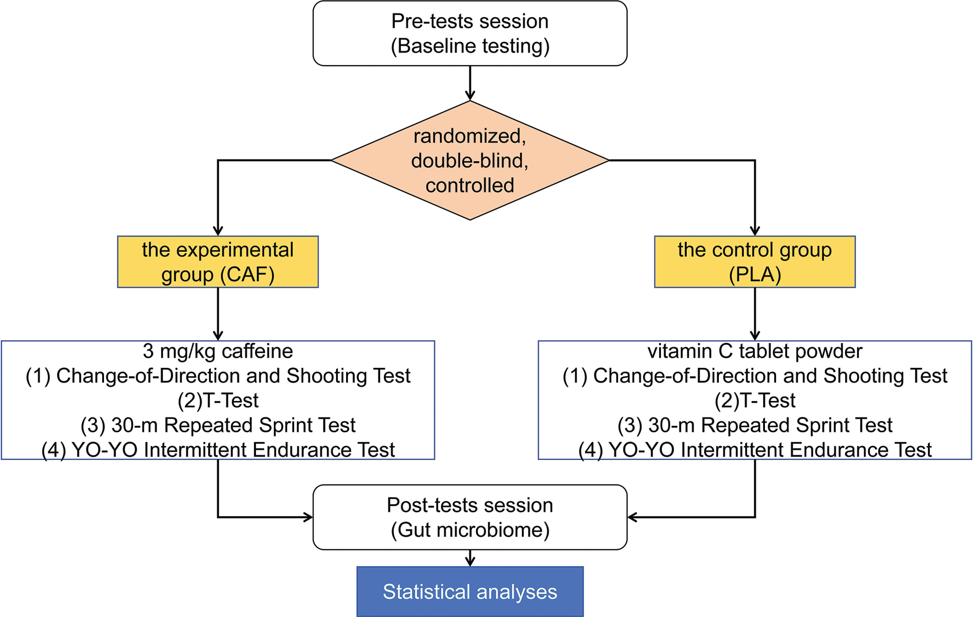 This study employed a randomized, double-blind, controlled, parallel-group design. The 32 participants were randomly and equally allocated to either the experimental group (CAF, n = 16 [where n = number of participants per group], aged 20.1 ± 1.3, weight 70.6 ± 8.7, height 178.6 ± 5.3, years of training 7.8 ± 0.7) or the control group (PLA, n = 16, aged 20.2 ± 1.0, weight 70.2 ± 7.9, height 177.9 ± 4.9, years of training 7.6 ± 0.5). Experimental group (CAF): Received caffeine supplementation at a dose of 3 mg/kg body weight, administered via Ironmaxx Ed tablets (Germany), each containing 200 mg of caffeine. The tablets were consumed with 250 ml of water under non-fasting conditions, 60 minutes prior to testing. Control group (PLA): Received a placebo consisting of vitamin C tablet powder, administered in an identical manner to maintain blinding. Following a 3-day dietary standardization and 24-hour caffeine/ high-intensity exercise abstinence, baseline testing commenced 2 hours post-breakfast, including aerobic capacity assessment (Firstbeat monitoring), T-agility tests (2 trials), 30-m repeated sprints (3 sets), and technical dribbling evaluation. Identical procedures were repeated on Day 7, with supplements administered doubleblind by an independent third party (a laboratory technician not involved in the study design, data collection, or analysis) 1 hour pretest. Participants and researchers remained blinded to group assignments throughout, ensuring identical testing conditions and timing between interventions. To minimize variables affecting changes in gut microbiota other than caffeine, all athletes stayed on campus and maintained a consistent daily routine during the trial period. They also chose to eat in the school cafeteria and maintained a similar diet and had no recent illnesses (Figure 1).