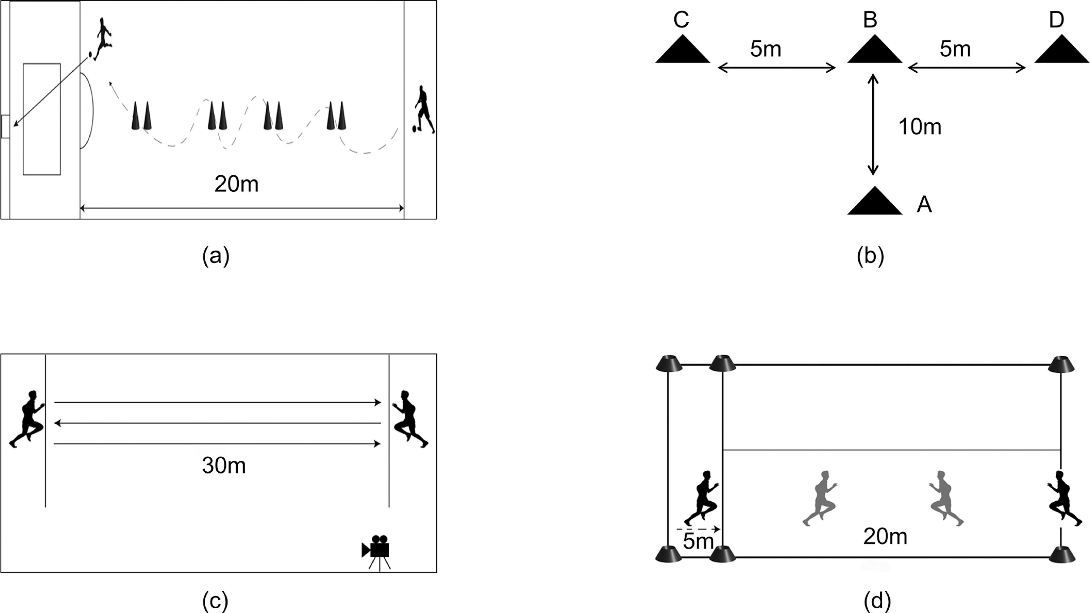 A T-shaped configuration (A-B: 10 m; B-C/B-D: 5 m each) was established using four cones. Participants sequentially: 1) sprinted from A to B, 2) laterally shuffled to touch D and C, 3) returned to B, and 4) backpedaled to A. Total completion time was measured (Figure 2b).