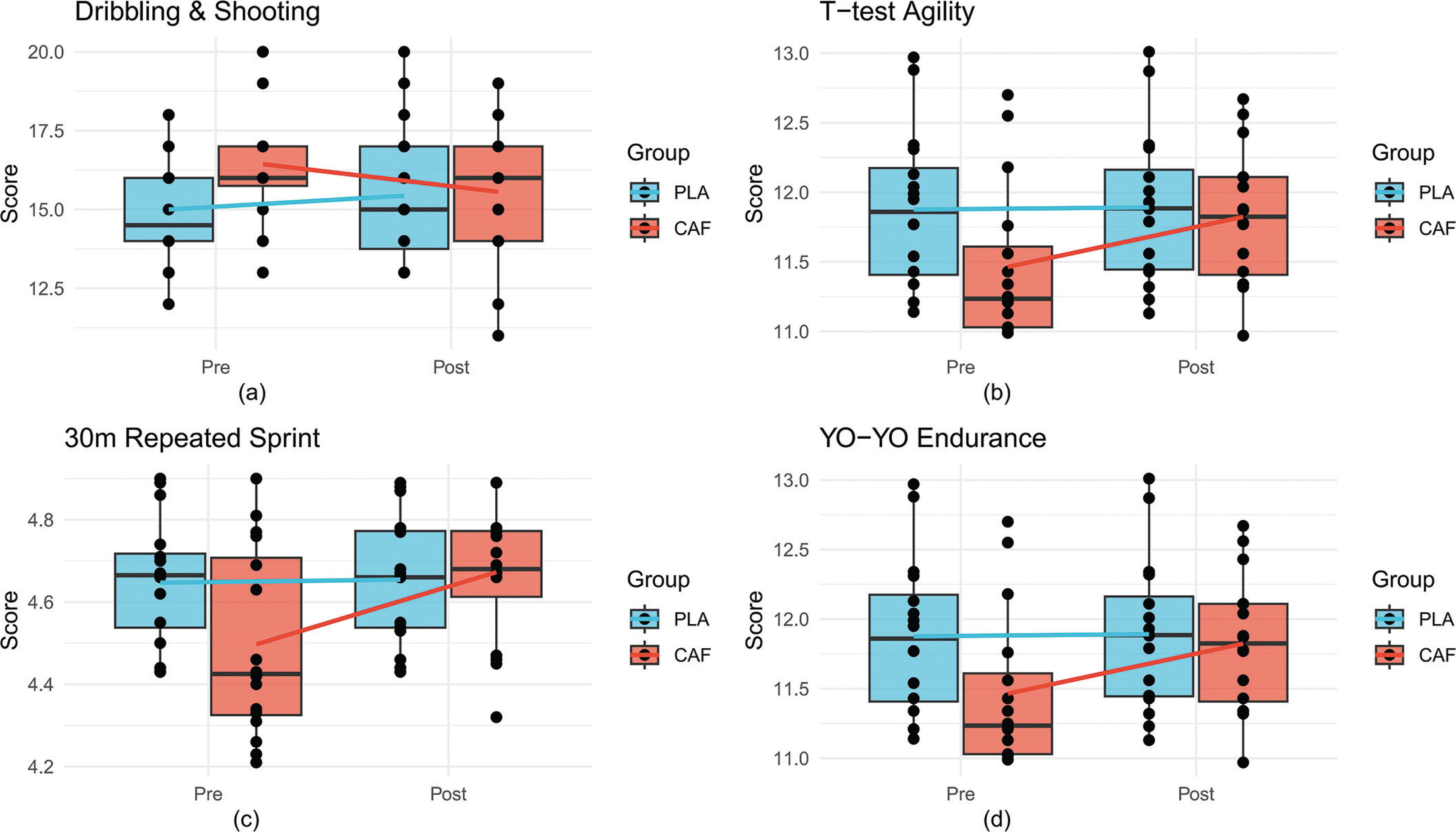 Boxplots comparing pre- and post-intervention performance metrics between CAF and PLA groups. Solid lines connect group means, and dots represent individual participants.(a) Change-of-Direction and Shooting Test; (b) T-Test, (c) 30-m Repeated Sprint Test, (d) YO-YO Intermittent Endurance Test.