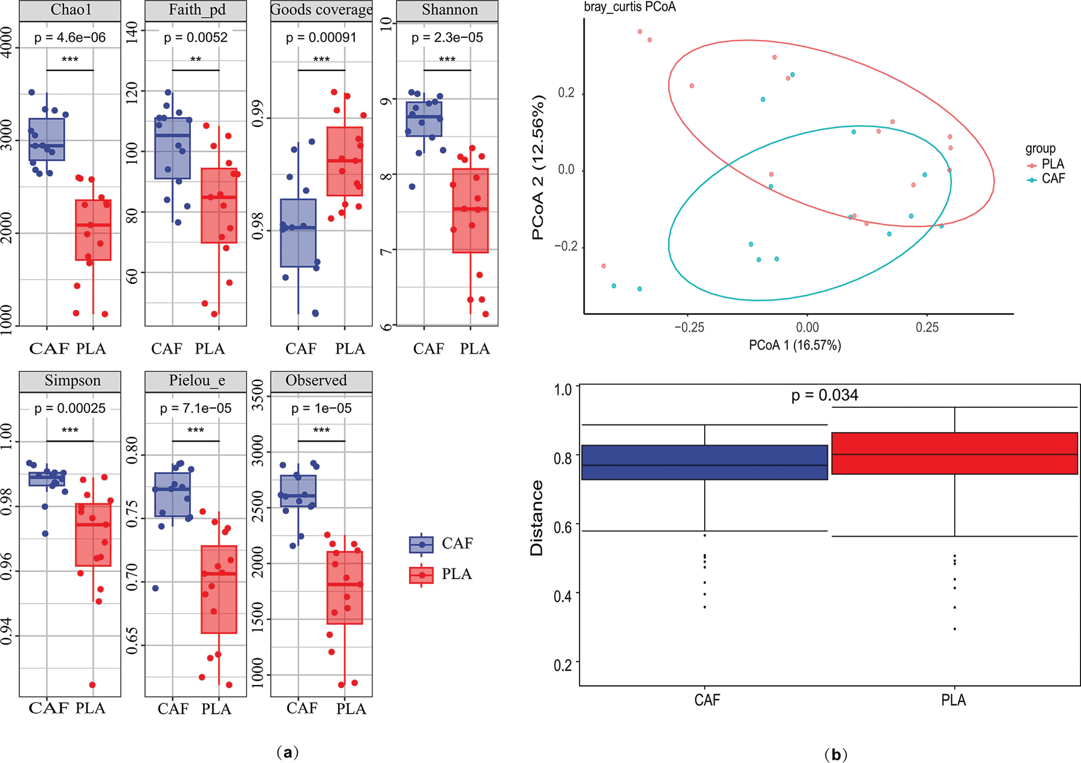 Gut microbiome analysis under caffeine supplementation. (a) Wilcoxon rank-sum tests were used to compare alpha diversity estimates of bacterial communities (p < 0.05). (b) Principal coordinate analysis (PCoA) based on Bray-Curtis distance at the ASV level and inter-group difference analysis were performed to compare data between groups, which were divided into experimental (CAF) and control (PLA) groups. *p < 0.05.