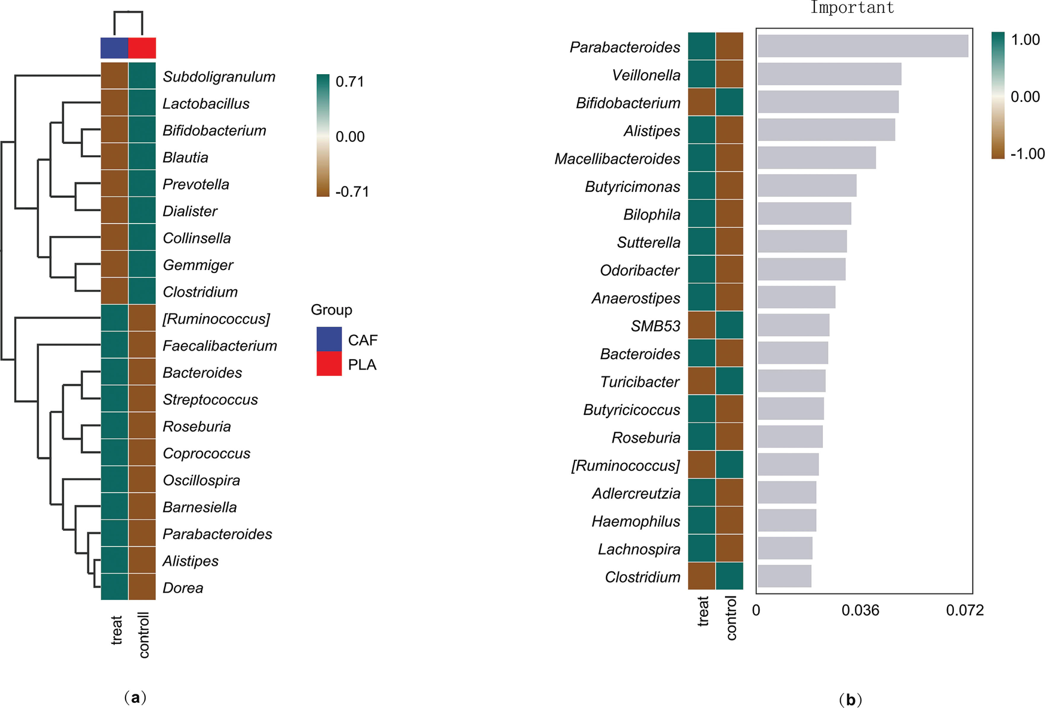 To explore the differences in microbial community composition (β-diversity) mainly attributed to species distribution, two methods were used. First, heatmaps compared species composition changes among groups and analyzed the distribution trends of species abundance within groups, based on the abundance data of the top 20 genera with the highest average abundance (Figure 5a). Second, the random forest algorithm identified potential taxonomic biomarkers and classified microbial community samples effectively, robustly, and accurately. At the genus level, ten-fold cross – validation was done to get the species importance scores of the classifier model. Species importance to the model decreases from top to bottom; highly important species can be seen as marker species for group differences. Parabacteroides, Veillonella, and Bifidobacterium have relatively high importance scores of 0.07, 0.049, and 0.048, respectively (Figure 5b).